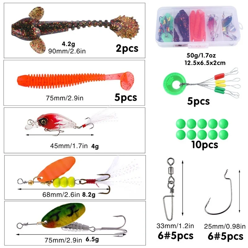 1 х Удочка 1 Рыболовная катушка 1 х сумка для переноски 1 x рыболовная леска 110yds 1 х пластиковая коробка для рыбалки 10x бусины для рыбалки 5 х рыболовный разъем 5 х коленчатый крюк 5 х резиновый поплавок для рыбалки 5x7,5 см/3,0 дюйма Мягкая приманка 2x9 см/3,5 дюйма Мягкая приманка