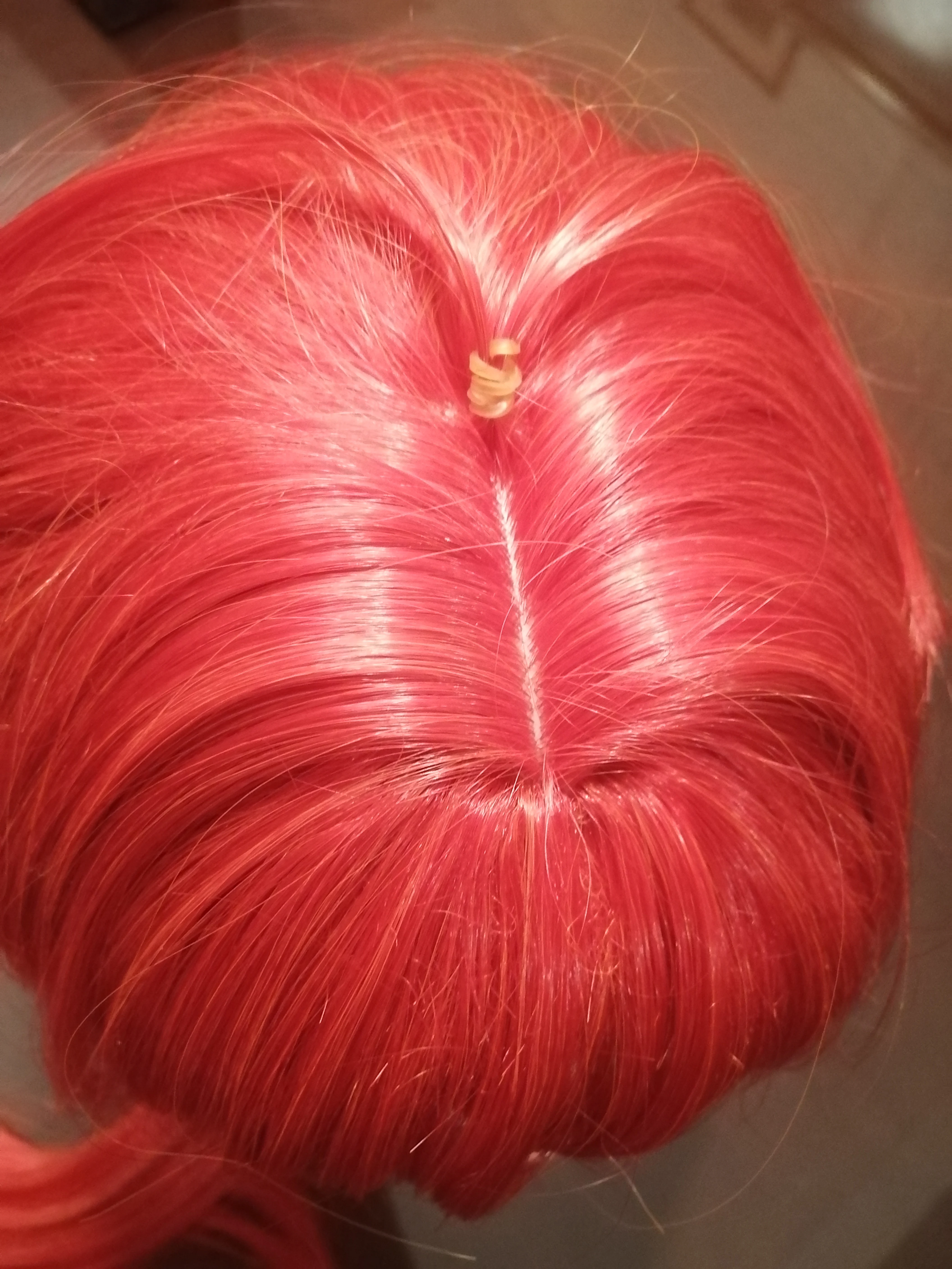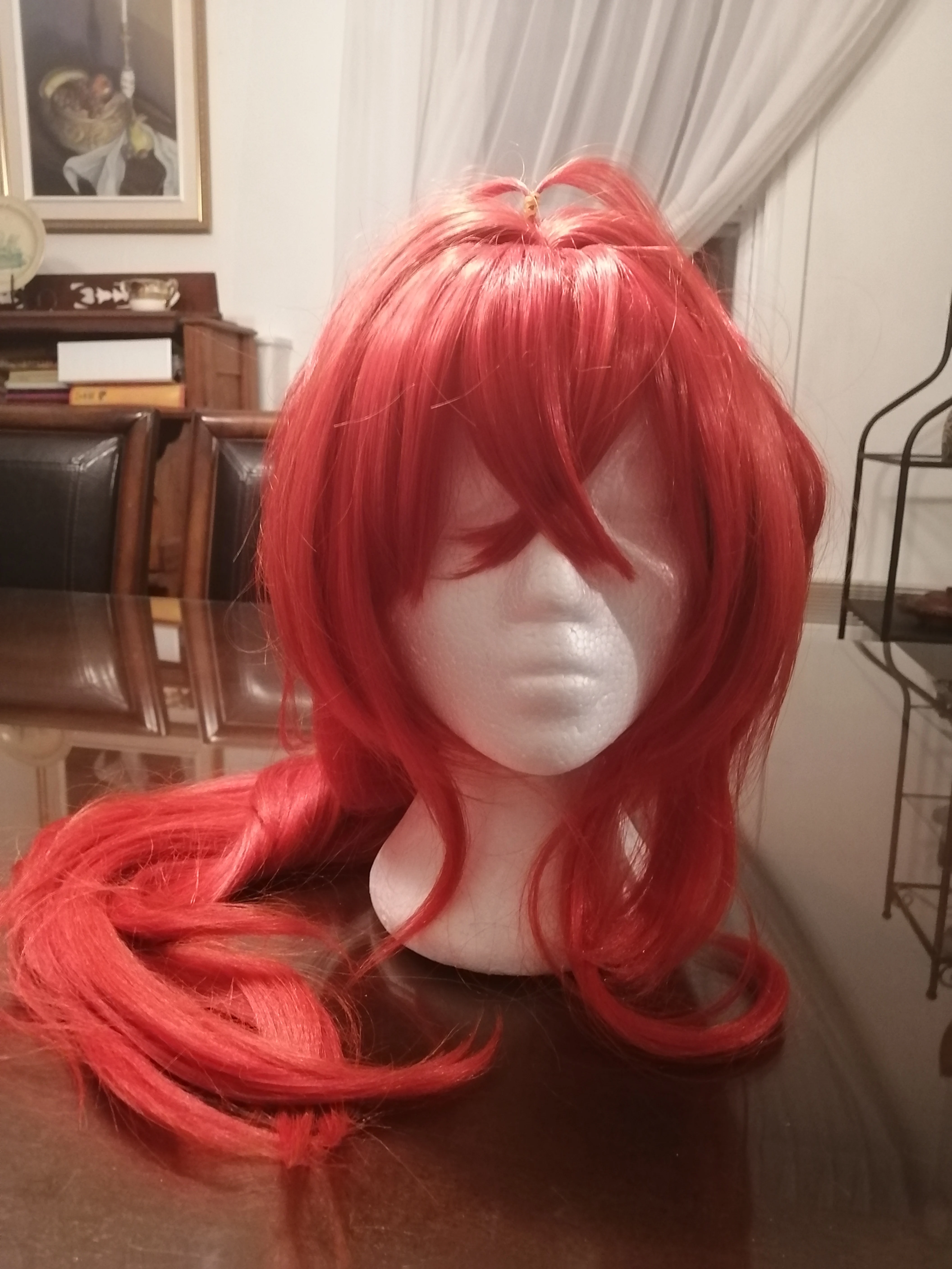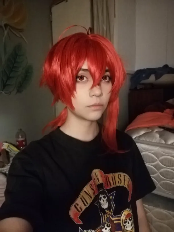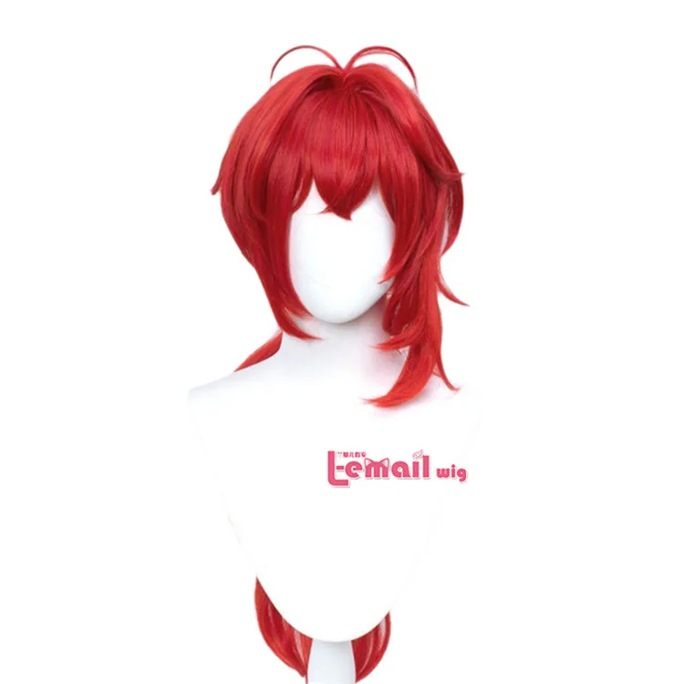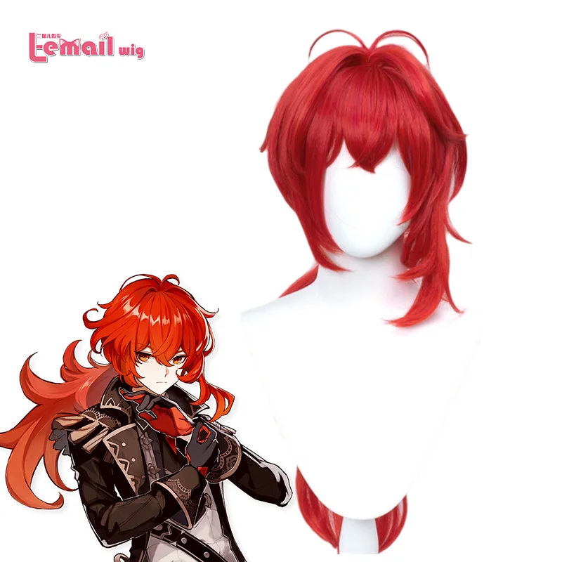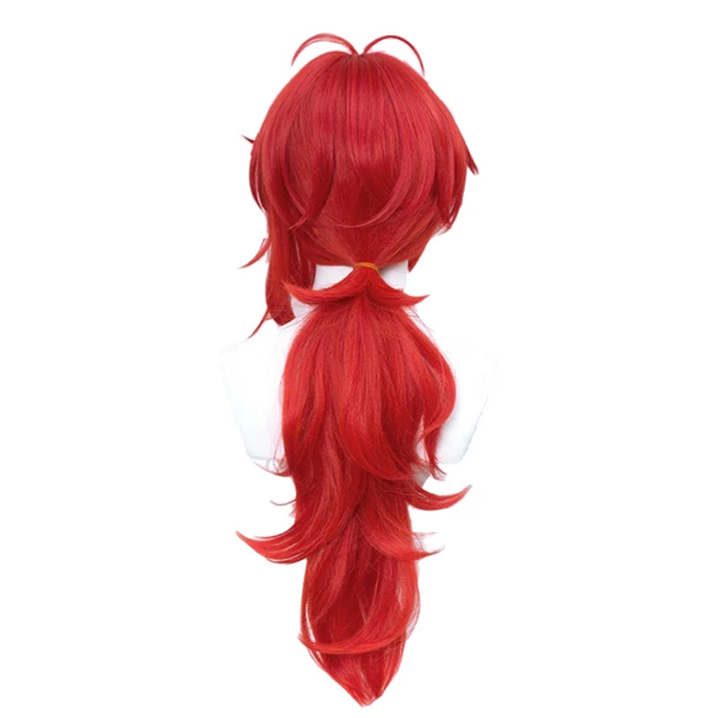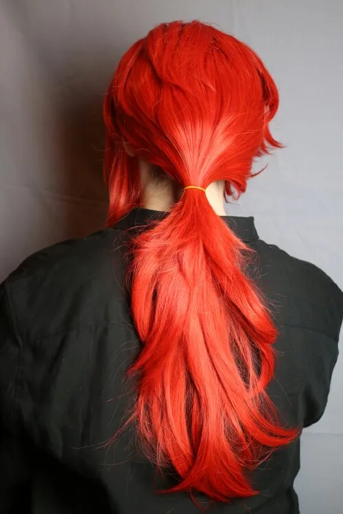 Парик очень хороший. У него так много волос, что мне нужно было прикрепить некоторые волосы с боков в хвост. Цвет очень точный для Diluc на мой взгляд. Парик не слишком блестящий и очень хороший. Это правильная длина для Diluc. Конский хвост немного текстурирован (я попробовал сделать фотографию, но я не уверен, что он действительно хорошо выглядит), и он не слишком заметен, делая конский хвост очень густым и пушистым. Я не большой поклонник желтой резинки, используемой для маленьких прядей волос на верхней части головы, но она съемная. Я бы посоветовал Вам выключить его для четкого выбора, если вы хотите сохранить там резиновую ленту.