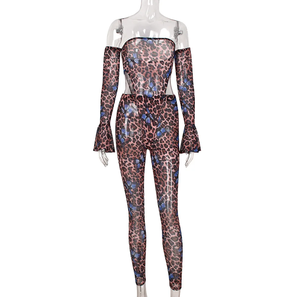 Женский леопардовый комплект из 2 предметов, боди с вырезом лодочкой, открытыми плечами и длинными расклешенными рукавами, длинные брюки с высокой талией