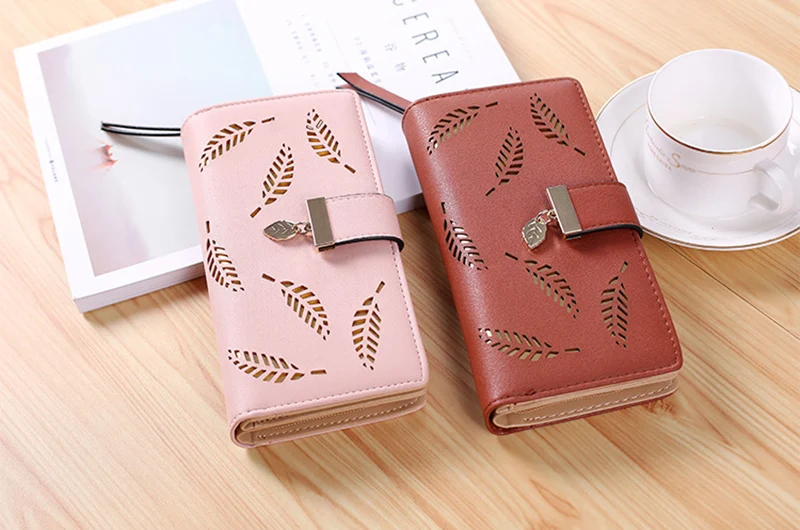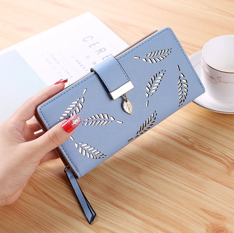 Длинный кошелек из искусственной кожи с несколькими отделениями для женщин, Дамский бумажник, ажурный клатч с листьями, кредитница