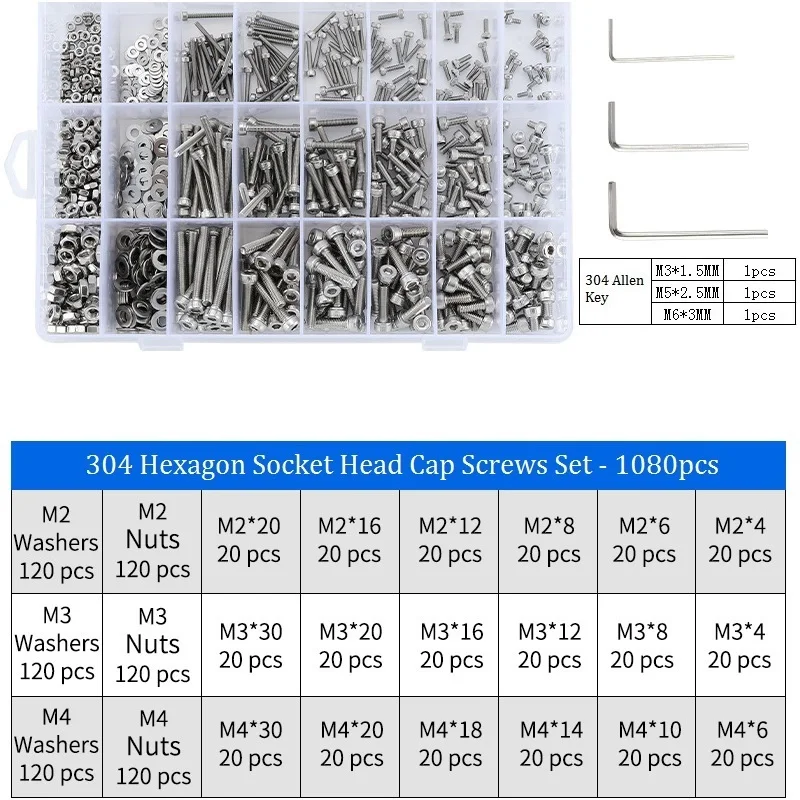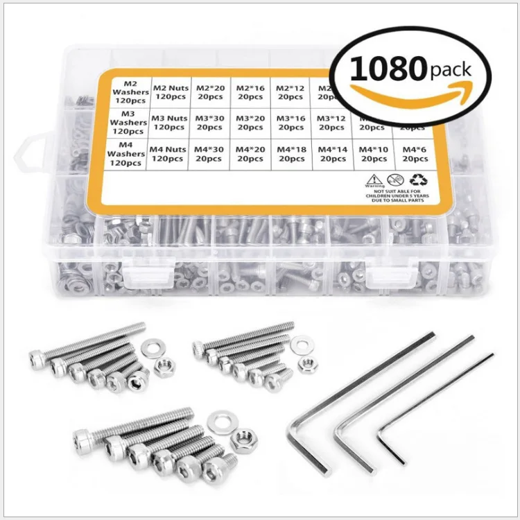 1080 шт.лот M2M3M4 304 Шестигранная головка из нержавеющей стали, винты с шестигранной головкой, гайки и шайбы с шестигранным ключом