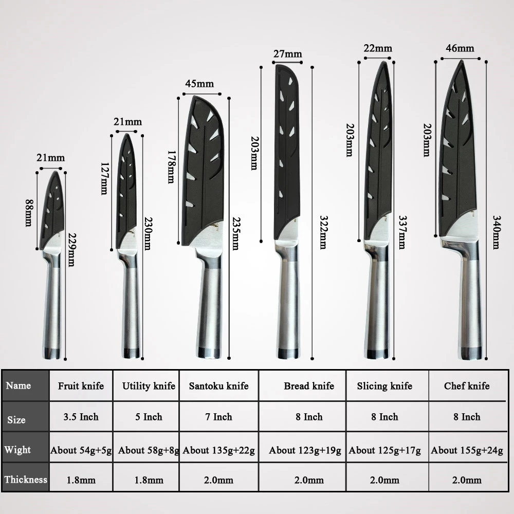 Технические характеристики Наименование: 6 шт./компл. Набор ножей шеф-повара Материал: 3CR1 4 нержавеющая сталь Размер: 8-дюймовый поварский Ножи 8 дюймов нарезки Ножи 8 дюймов для хлеба Ножи 7 дюймов Santoku Ножи 5 дюймов Универсальный Ножи 3,5 дюймовый фруктовый нож Примечание: Каждый нож Поставляется с оболочкой после покупки. Обратите внимание: Измерения измеряются вручную. Это нормально иметь небольшую погрешность.