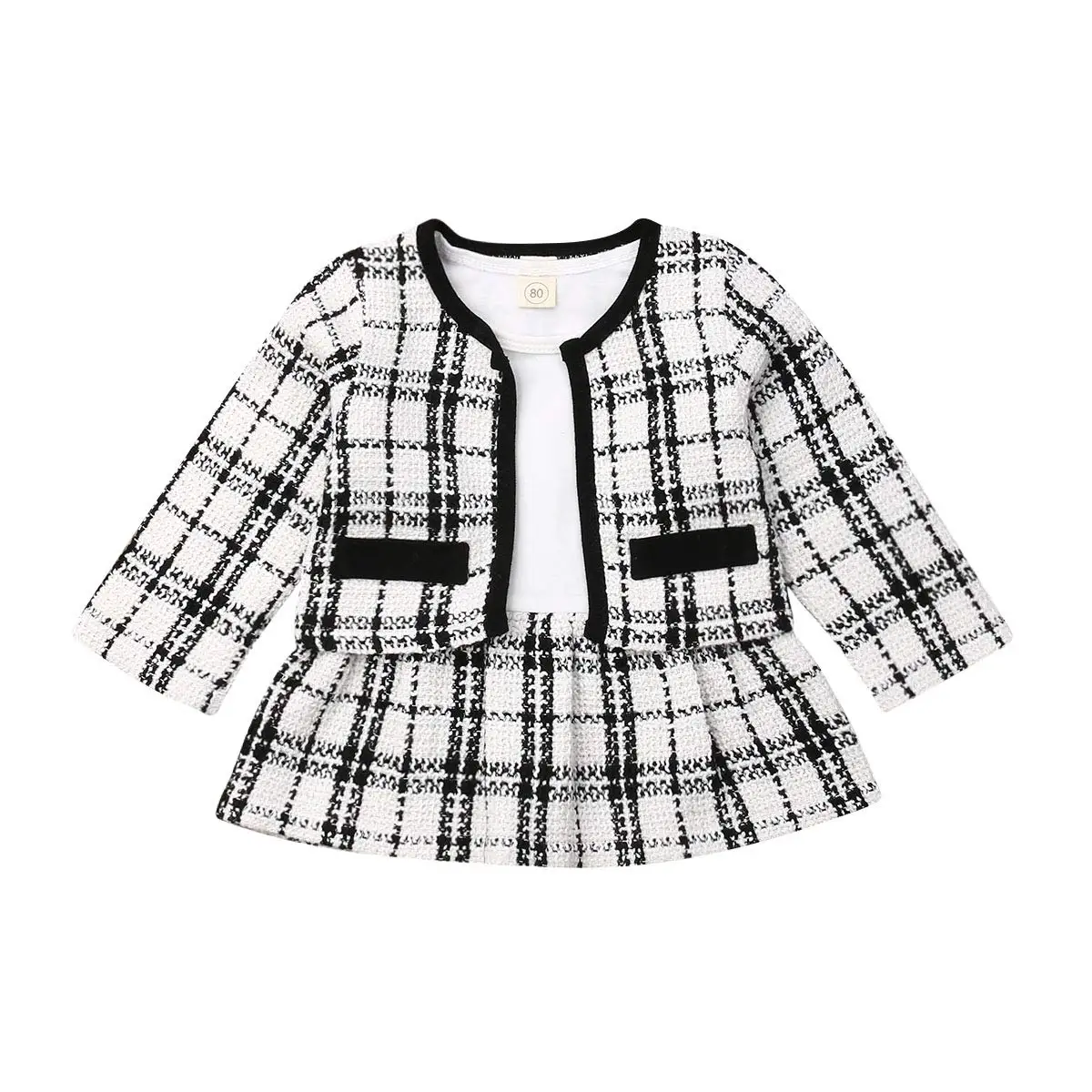 От 1 до 6 лет-осенняя одежда для малышей Детское пальто в клетку с длинными рукавами для маленьких девочек на день рождения топы + платье теплая одежда детская одежда из 2 предметов