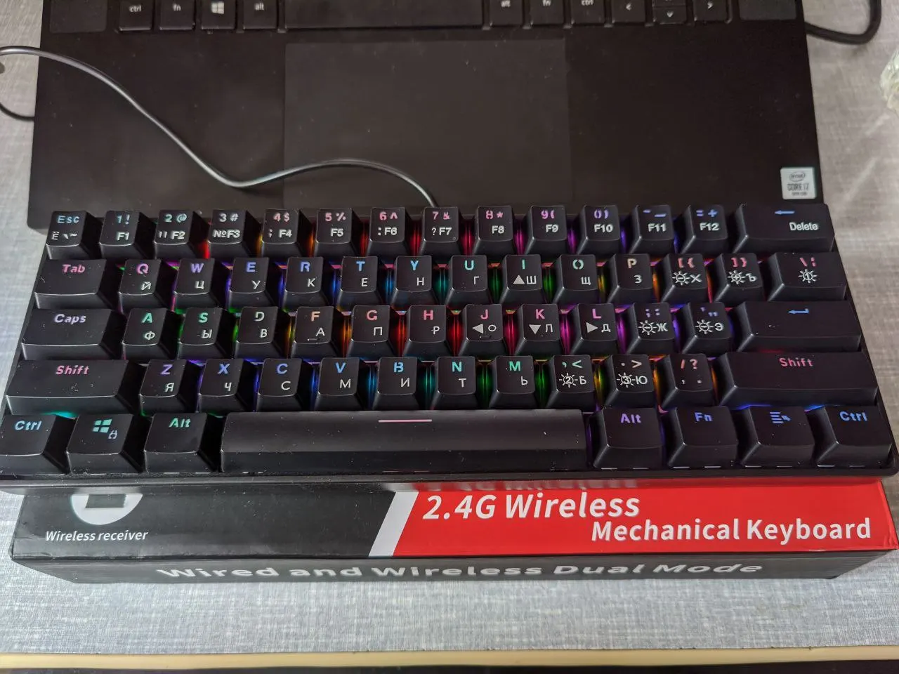 Начнем с хорошего Клавиатура пришла целая, рабочая в короткое время. На этом к сожалению все. Ужасный пластик, либо клавиатура кривая либо наклейки, потому что клавиатура качается и не стоит ровно на поверхности. Ужасная подцветка, лучше бы ее не делали. Но самое ужасное, это гравировка, я хотел без нее, но доствка в россию возможно только с гравировкой и она отвратительная. Посадка капов тоже так себе, тяжело печатать она не под углом находится а доп ножек нет, сами капы маленькие очень, у меня были клавы такого формата но там печать не вызыывала пробблем, тут же это тяжело делать. Нет шипцов для доставания капов, в общем клавиатуру не советую Пользоваться буду конечно, привыкну, но лучше доплатить 1к и взять другую модель. Тот же Ajazz на порядок выше качеством. В любом случае спасибо продавцу за то. что быстро отправил клаиватура