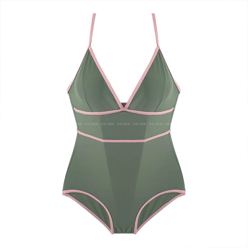 Сексуальный цельный купальник с высоким вырезом, Женская однотонная одежда для плавания, монокини с открытой спиной, купальник в стиле пэчворк, корейский купальный костюм с пуш-ап зеленого цвета