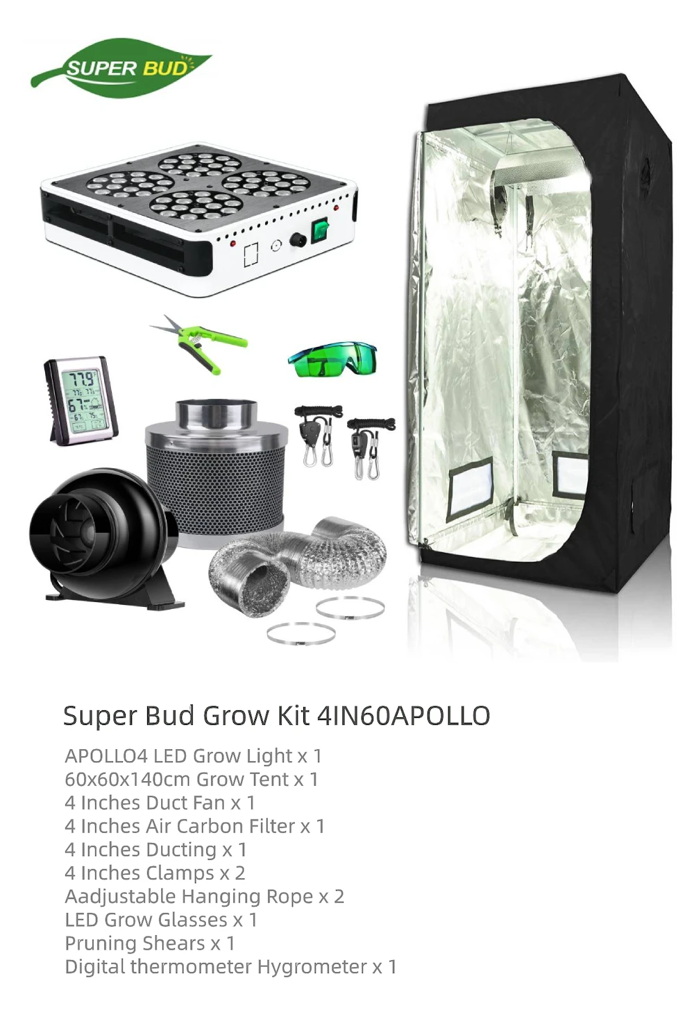 Комплект для гидропонных систем Super Bud, 4-дюймовая система контроля запаха воздуха, тент для выращивания 2 дюйма, квантовая доскасветодиодный светильник Apollo4