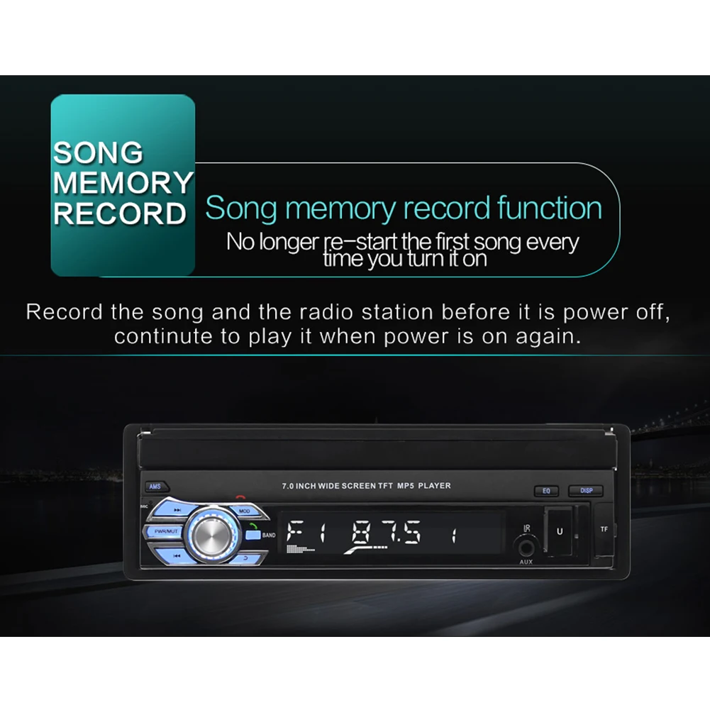 Особенность:1. 7-дюймовый большой экран для удовлетворения потребностей в аудио и видео. Разрешение экрана составляет 800x480, поддерживает устройство с U-диском/TF-картой, функцию возобновления памяти песен, аудиовход AUX, тексты песен LRC и дисплей ID3, дистанционное управление, зарядка USB-устройства.
