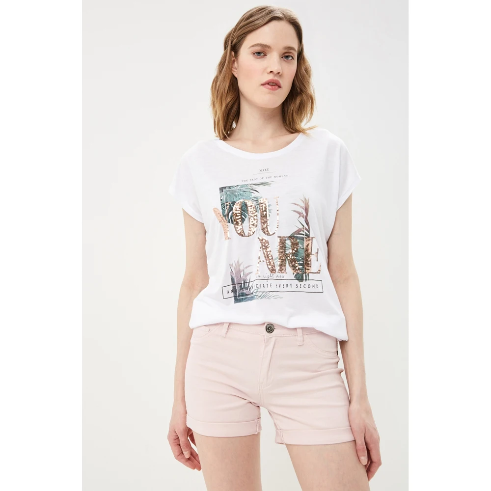 Производитель: Россия. Коллекция: ВЕСНА-ЛЕТО 2019. ~ Стильный принт, золотая россыпь пайеток и воодушевляющая надпись - в этой модели есть всё необходимое, чтобы украсить ваш повседневный гардероб. Футболка имеет прямой силуэт и цельнокроенные рукава. Изделие выполнено из комфортного в ношении износоустойчивого трикотажа..