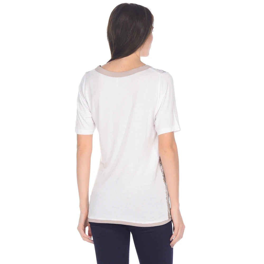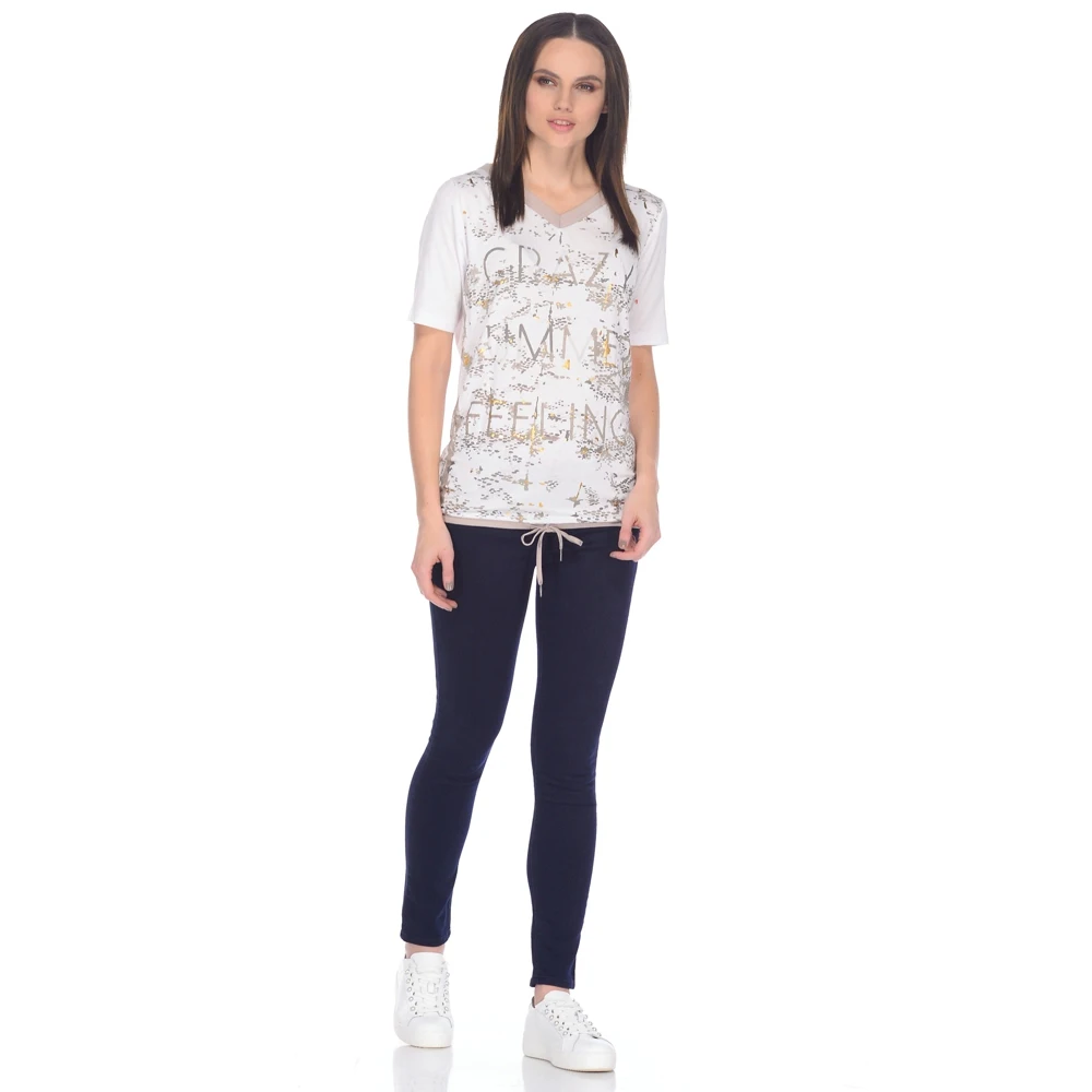 Производитель: Россия. Коллекция: ВЕСНА-ЛЕТО 2018. ~ Оригинальная модель украсит ваш повседневный гардероб и добавит ему блеска. Крупный текстовый принт с золотистым напылением - изюминка этой модели. Футболка с V-образным вырезом горловины дополнена кулиской с завязывающимся шнурком. Модель выполнена из мягкого и шелковистого вискозного трикотажа с добавлением эластана..