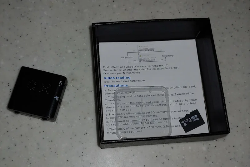 Аппарат пришёл за три недели в Украину. Был упакован в простой пузырчатый конверт и в коробку. Всё пришло целое и рабочее. Сразу зарядил. Снимает, как для такого размера, вполне сносно. Объекты видно чётко. При искуственном освещении немного подсвечивается инфракрасной подсветкой, видимо малая освещённость была. В темноте снимает не так чётко, но на хорошее расстояние. Метров 5 нормально можно понять, дальше только в общих чертах. Дату и время записи можно изменить с помощью текстового файла, который открывается на компьютере через картридер. Сама камера на компьютере не видна, только заряжается от mini USB. Для пробы ставил флешку 4 класса, работает! Работу датчика движение пока не понял, постараюсь разобраться. Аккумулятор слабенький, но порядка 20-30 минут тянет. Покупкой пока доволен, посмотрим как дальше будет работать. Продавца рекомендую!