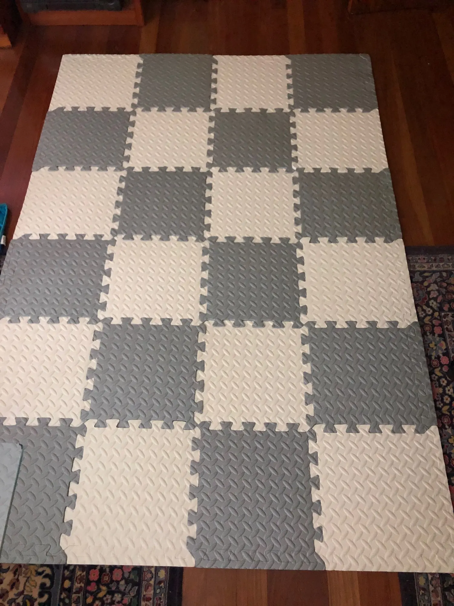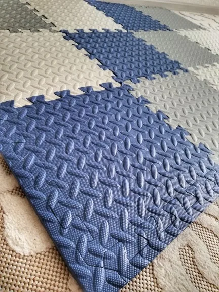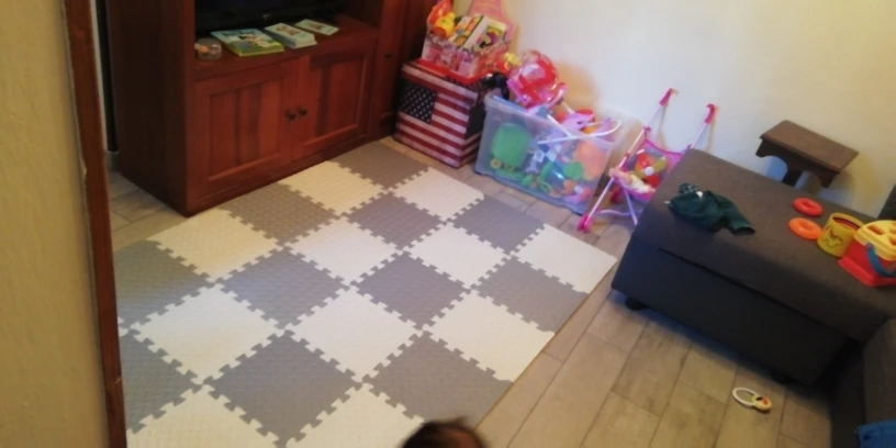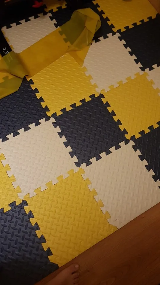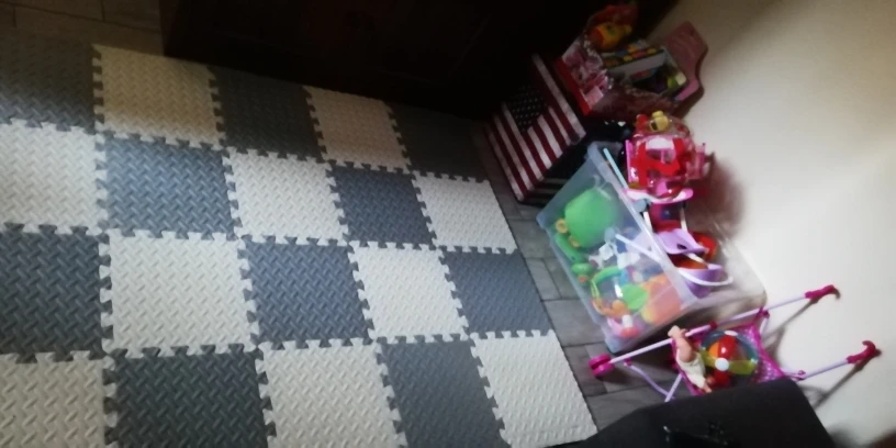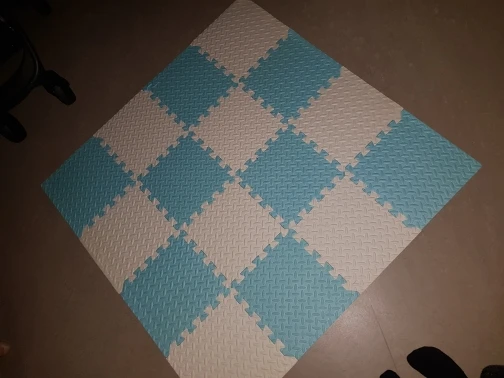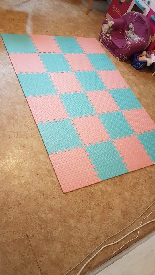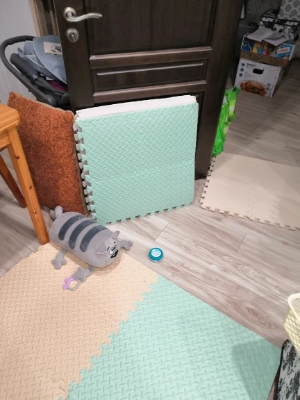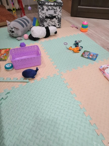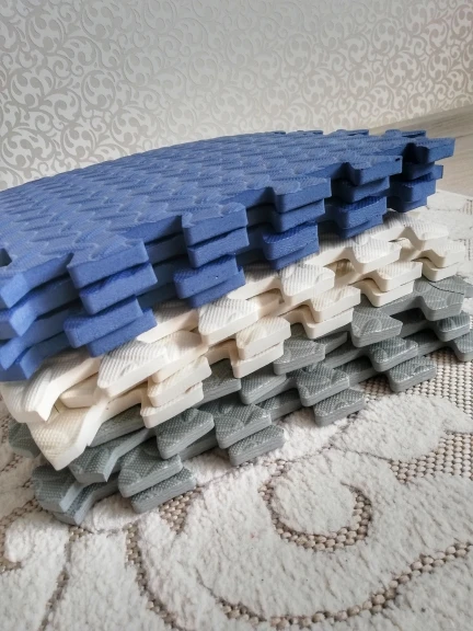 Доставили коврики до дома. Цвета приятные, благодаря окантовке смотрятся аккуратно. Ходить и сидеть тепло и довольно мягко, поверхность протирается и моется очень легко, правда у ребёнка проскальзывают коленки, пока сложно ползать. Зато ребёнку очень нравится разбирать коврик и жевать. Брали коврик с собой, 120х120 см уложились в два небольших пакета.