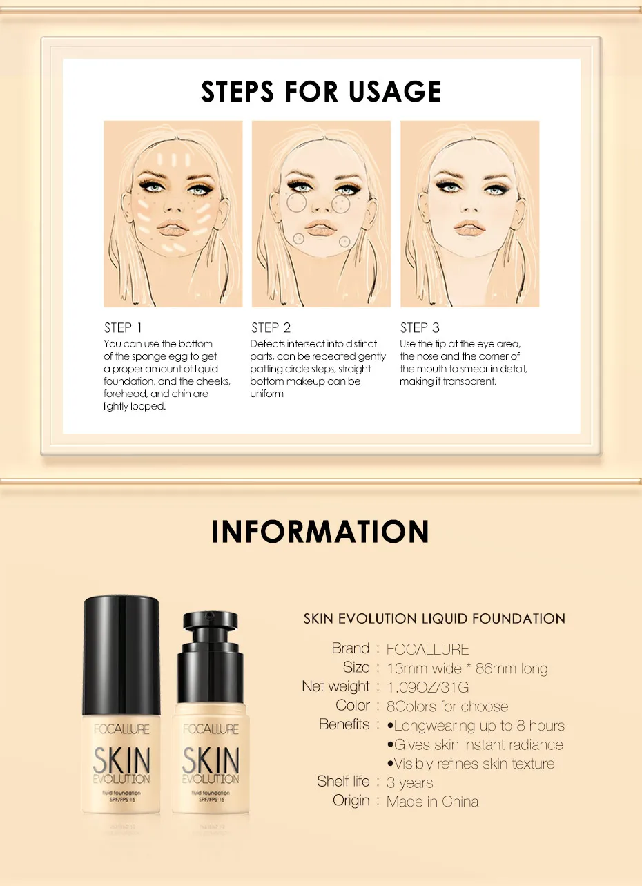 Описание:-Бренд FOCALLURE Foundation-это легкая основа, которая повышает сияние, чтобы оставить кожу шелковистой и гладкой.-Специально разработан с добавлением активных ингредиентов для восстановления и восстановления кожи, уменьшая видимые тонкие линии и морщины.Натуральный экстракт японского вечнозеленого спицебуша, минимизирует внешний вид старения и обеспечивает антиоксидантную защиту от экологических стрессов.-Роскошная основа повышает эластичность кожи.Рекомендации по цвету: 02 , 03, 04Как выбрать цвета:Очень красивый тон кожи: 01Светлый тон кожи: 02Естественный, но приятный тон кожи: 03Цвет желтой кожи: 04Желтовато-черная кожа тон: 05Здоровый тон кожи: 06 , 07 , 08Примечание:Если два похожих номера цветов не могут быть выбраны, рекомендуется выбрать более глубокий номер цвета, чтобы сделать кожу более текстурированной.Указания для использования:Нанесите щеткой, губкой или кончиками пальцев на предпочитаемую грунтовку. Слой по мере необходимости для более полного покрытия.Подробности:Чистый влажный: 30 гУпаковано в розничную упаковкуГарантия качестваГигиеническое Разрешение: GD.FDA(2014)Разрешение на производство: 29-XK-3851Критерий управления: QB/T1976-2004Характеристика:1. Формула контроля масла позволяет естественному жидкому основанию Стадия до 12 часов.2. Обеспечивает великолепный, легкий естественный цвет без сушки, качения или выцветания.3. Имеет кремовую формулу, которая плавно скользит по шелку и легко смешивается.