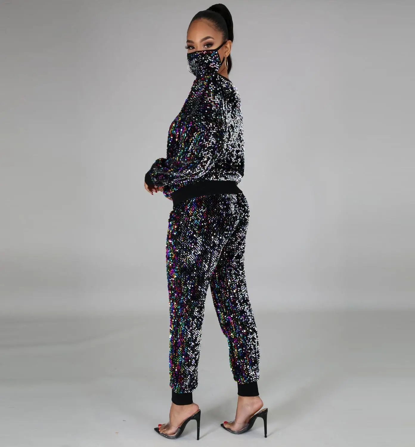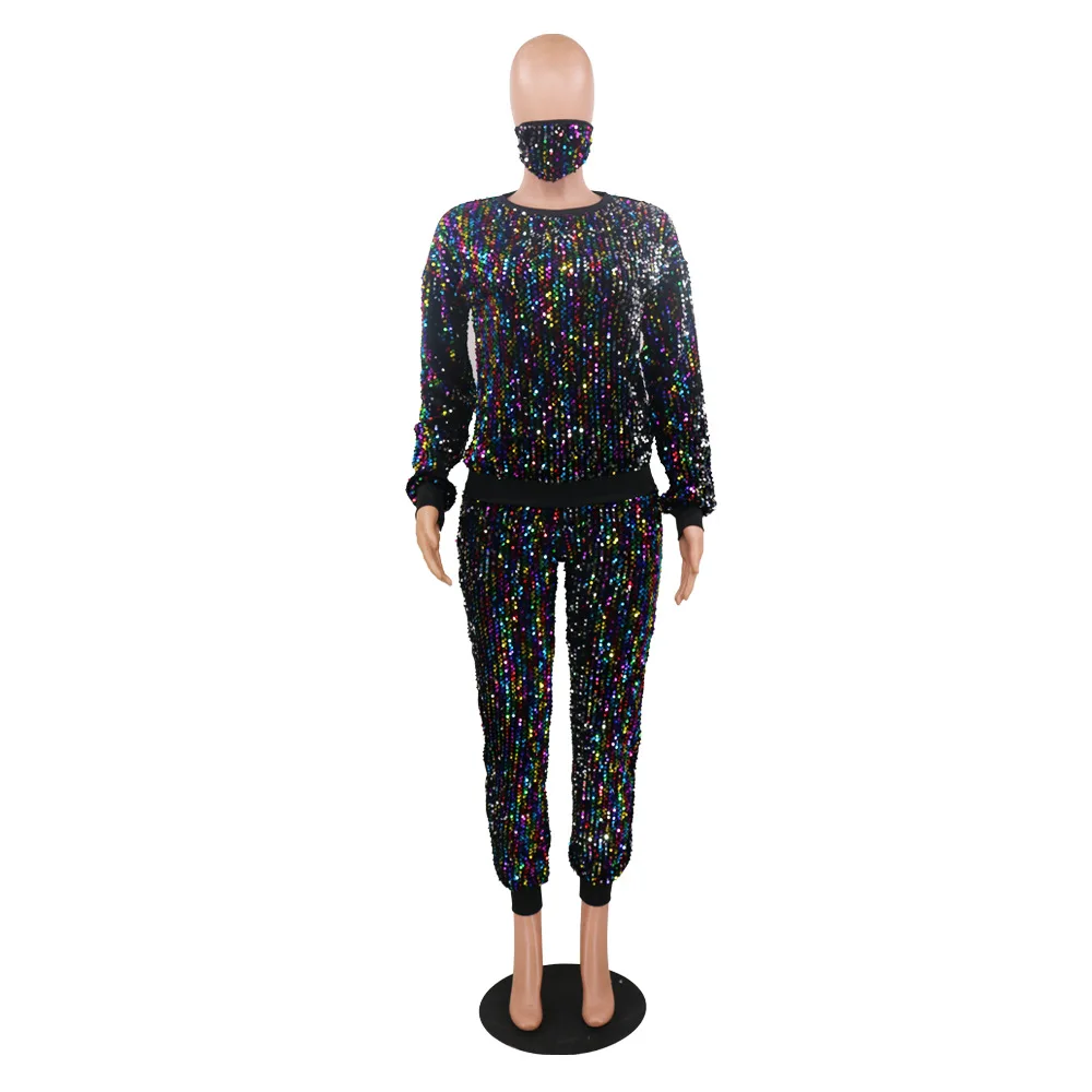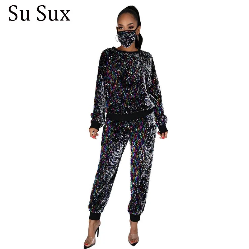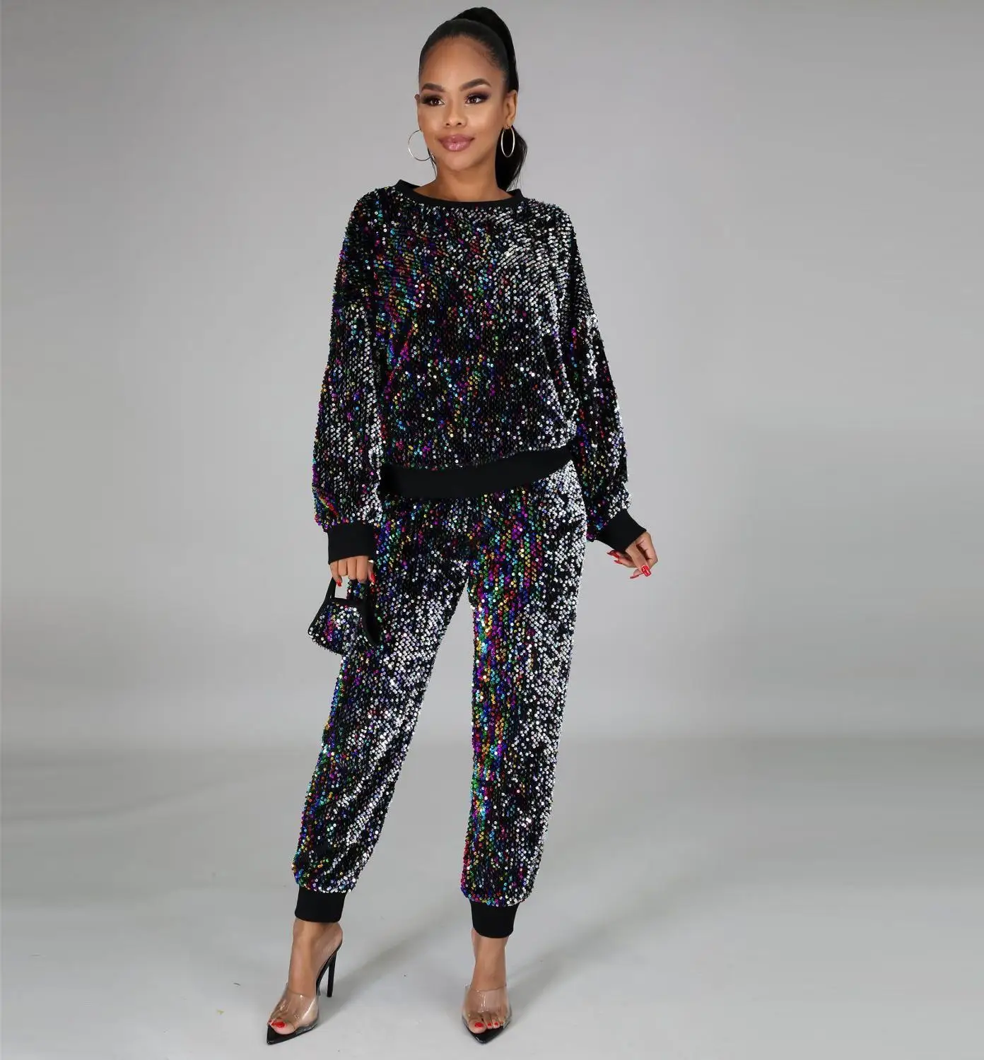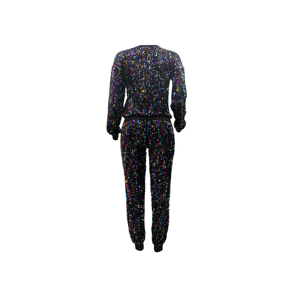Осенне-зимний комплект из 2 предметов с блестками, Женский Повседневный Спортивный костюм, блестящий пуловер с круглым вырезом и брюки-карандаш, костюм, женский костюм