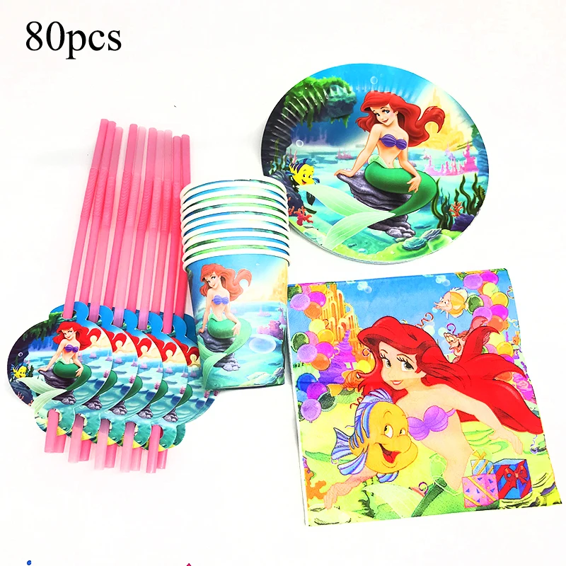80 шт Русалка одноразовая посуда Русалочка День рождения украшения холодного сердца , ручалочкой Ариэль салфетки покрытие стола соломинки
