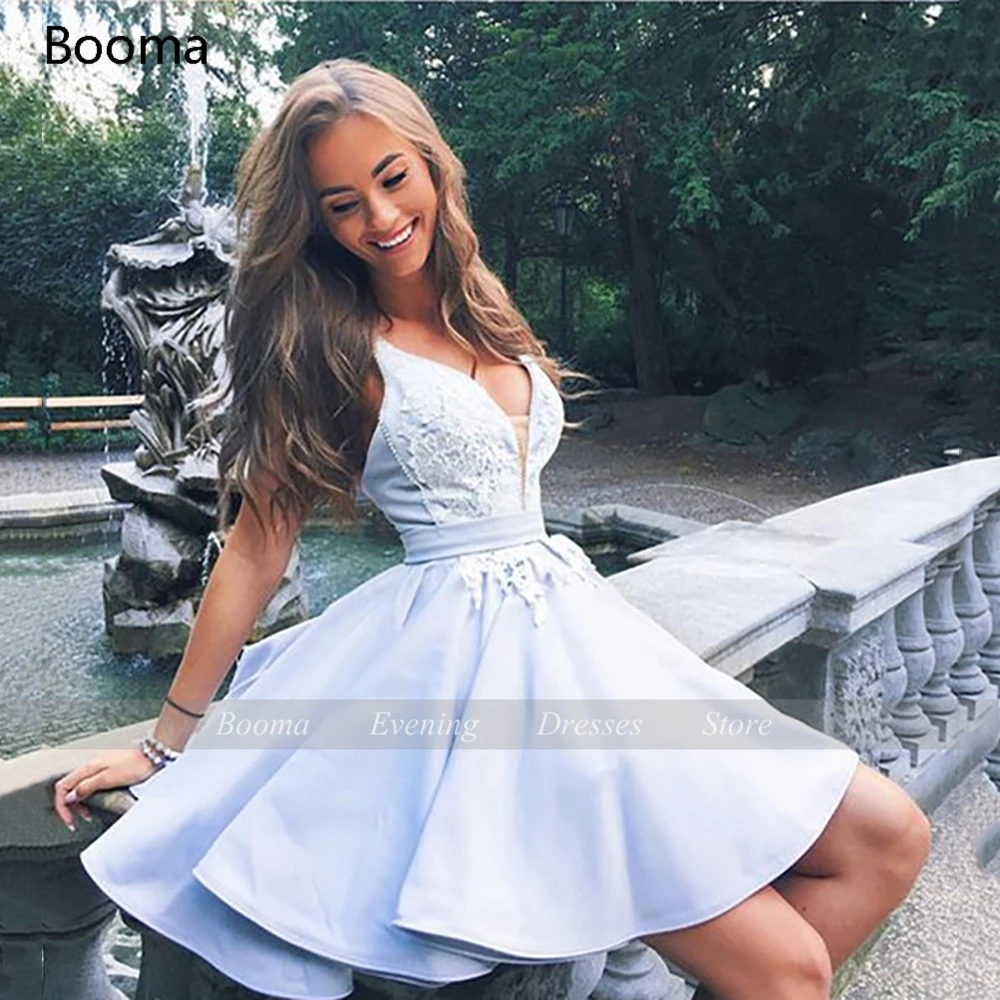 Милое синее атласное Мини платье для выпускного вечера 2021 сексуальное короткое вечернее платье с V-образным вырезом и аппликацией вечернее платье-трапеция выше колена