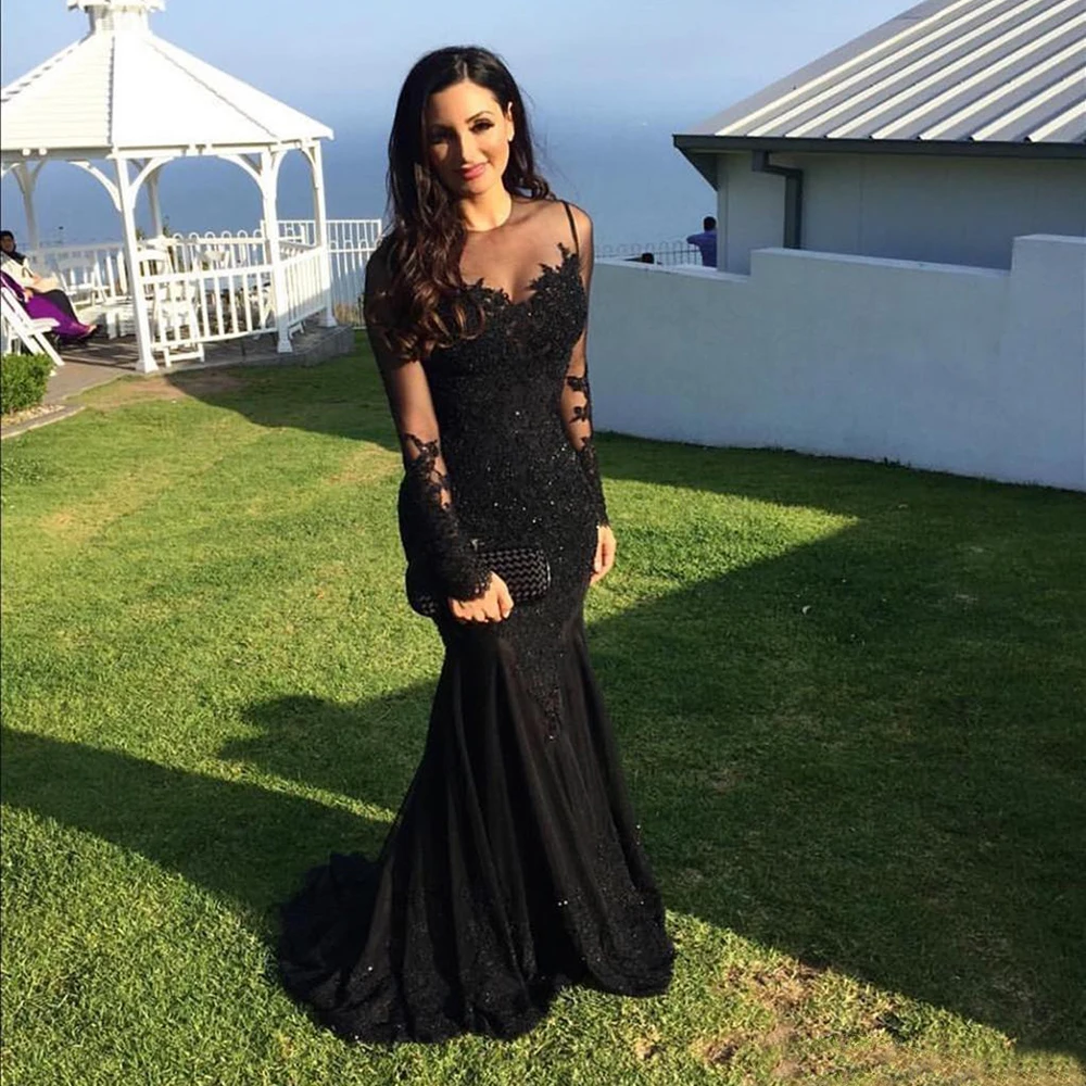 Черные вечерние платья с юбкой-годе, круглым вырезом и аппликацией