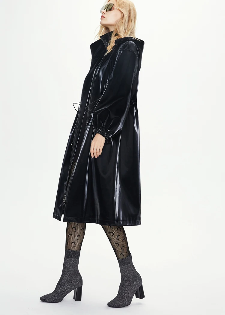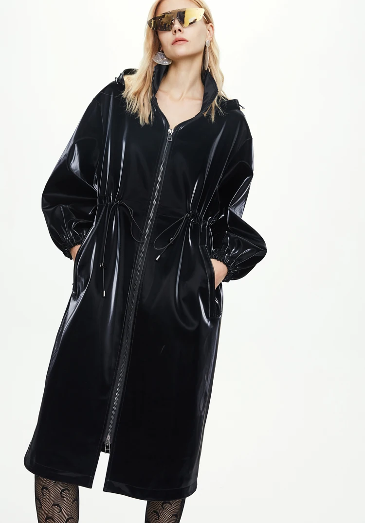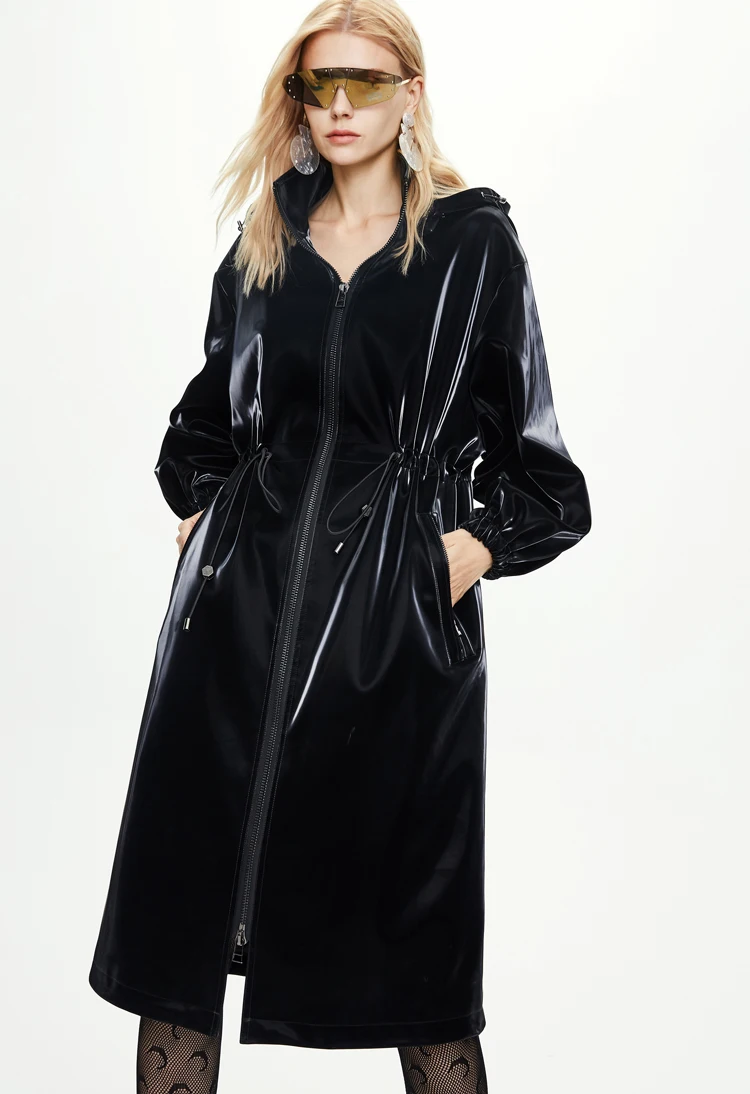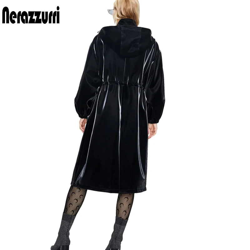 Nerazzurri Длинный черный теплый блестящий женский тренч из лакированной кожи с длинным рукавом с капюшоном Модная осенняя ветровка 2020 на молнии пальто оверсайз женское плащ женский кожа. кожаное пальто женское осень