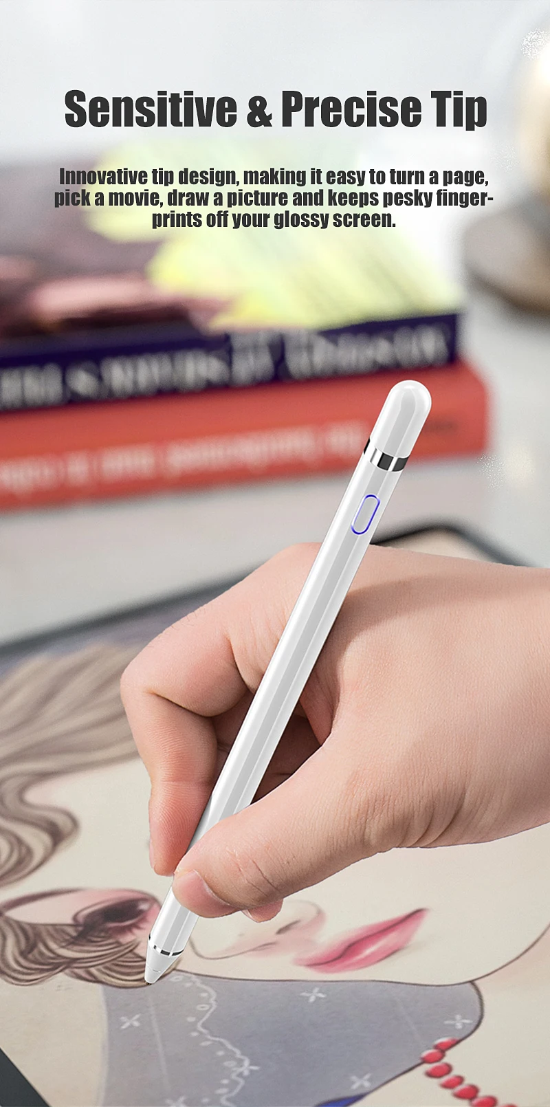 -Гладкая и без задержек-Однокнопочный переключатель-Универсальный iOS/Android-Длительный срок службы батареи-Чувствительный и точный наконечник-Функция автоматического сна-Зарядка через Micro-USB