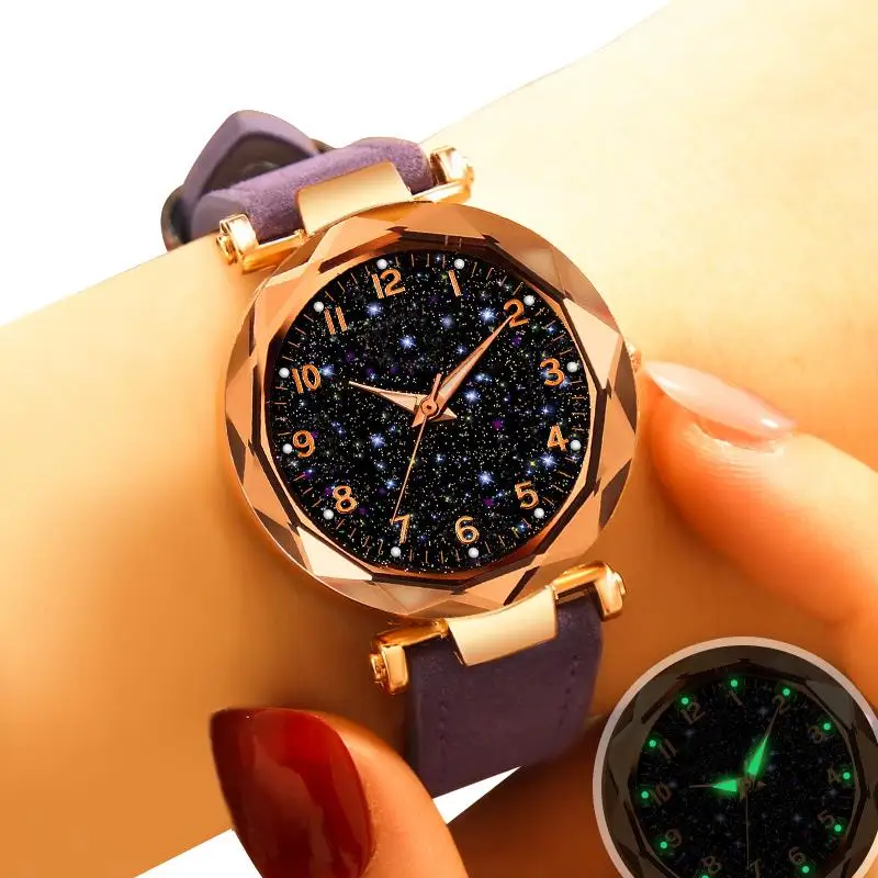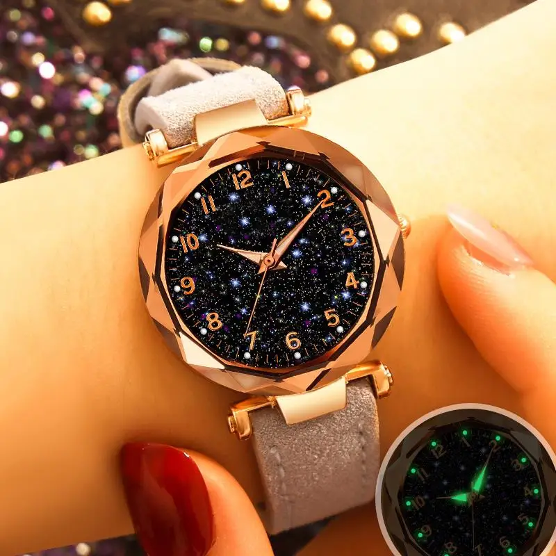 Часы женские кварцевые со звездным небом, кожаным ремешком