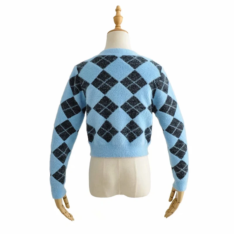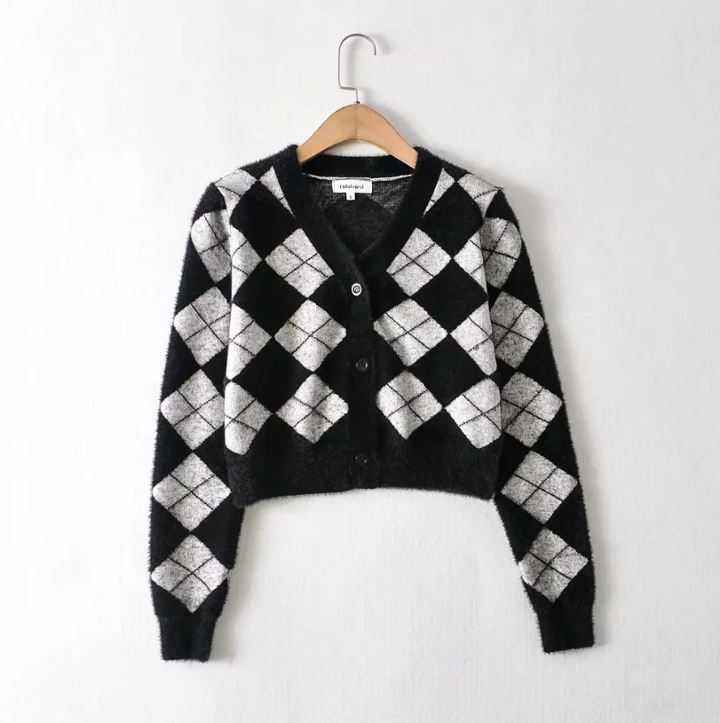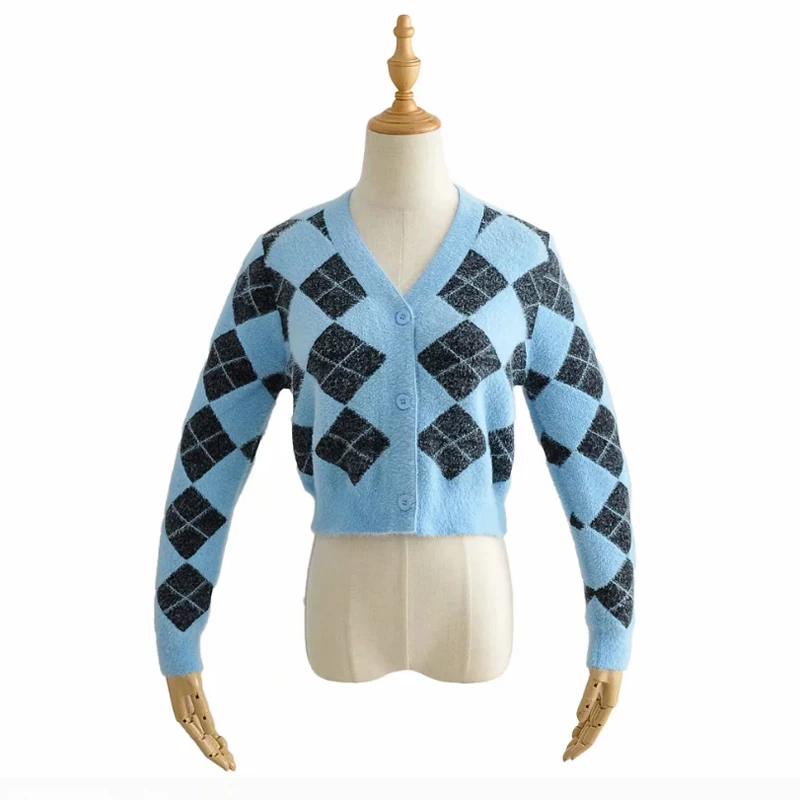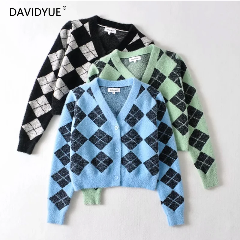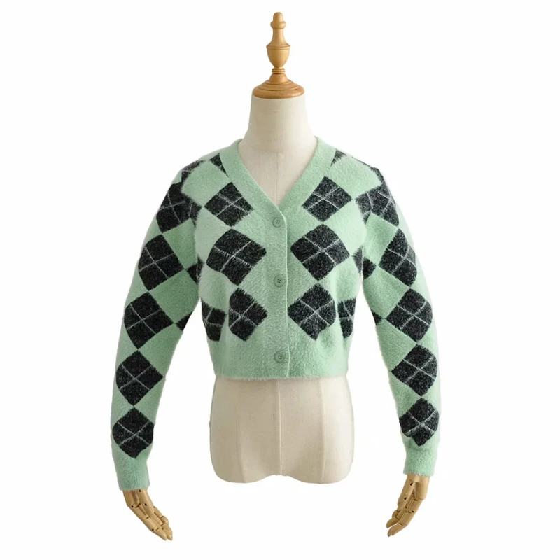 Свитер женский, кардиган, короткий топ с длинным рукавом в Корейском стиле, вязаные зеленые кардиганы, винтажные клетчатые свитера на пуговицах, Рождественский свитер