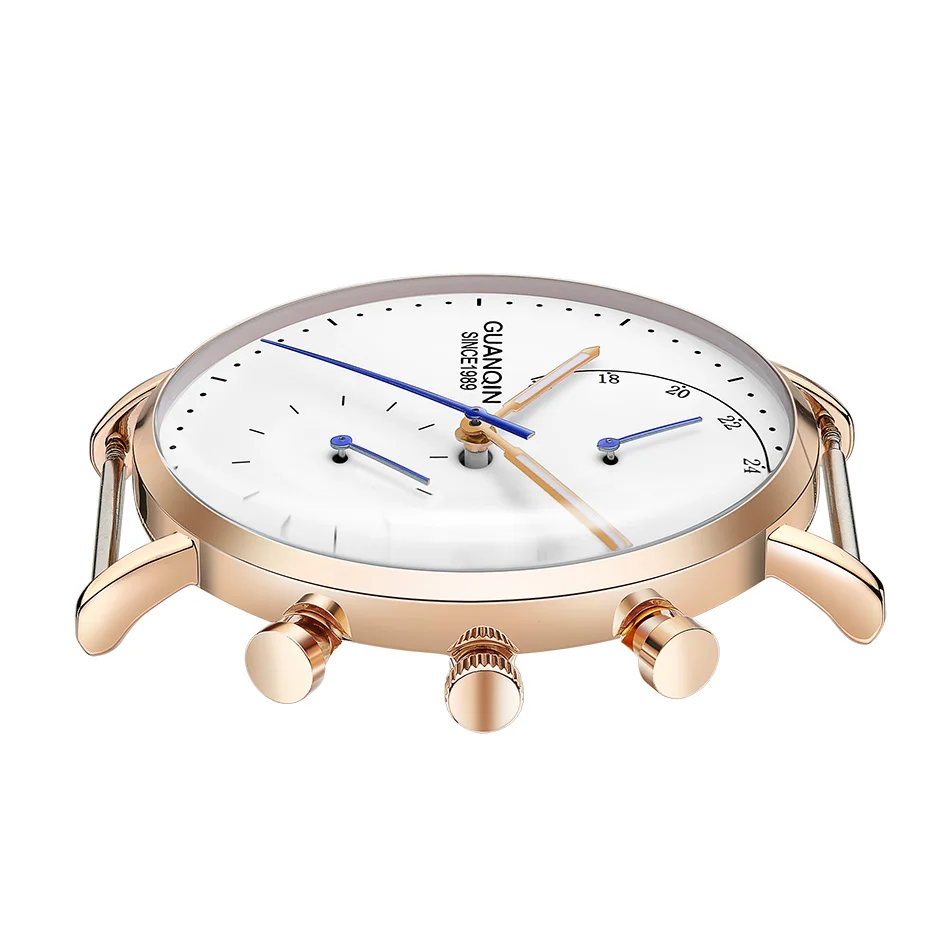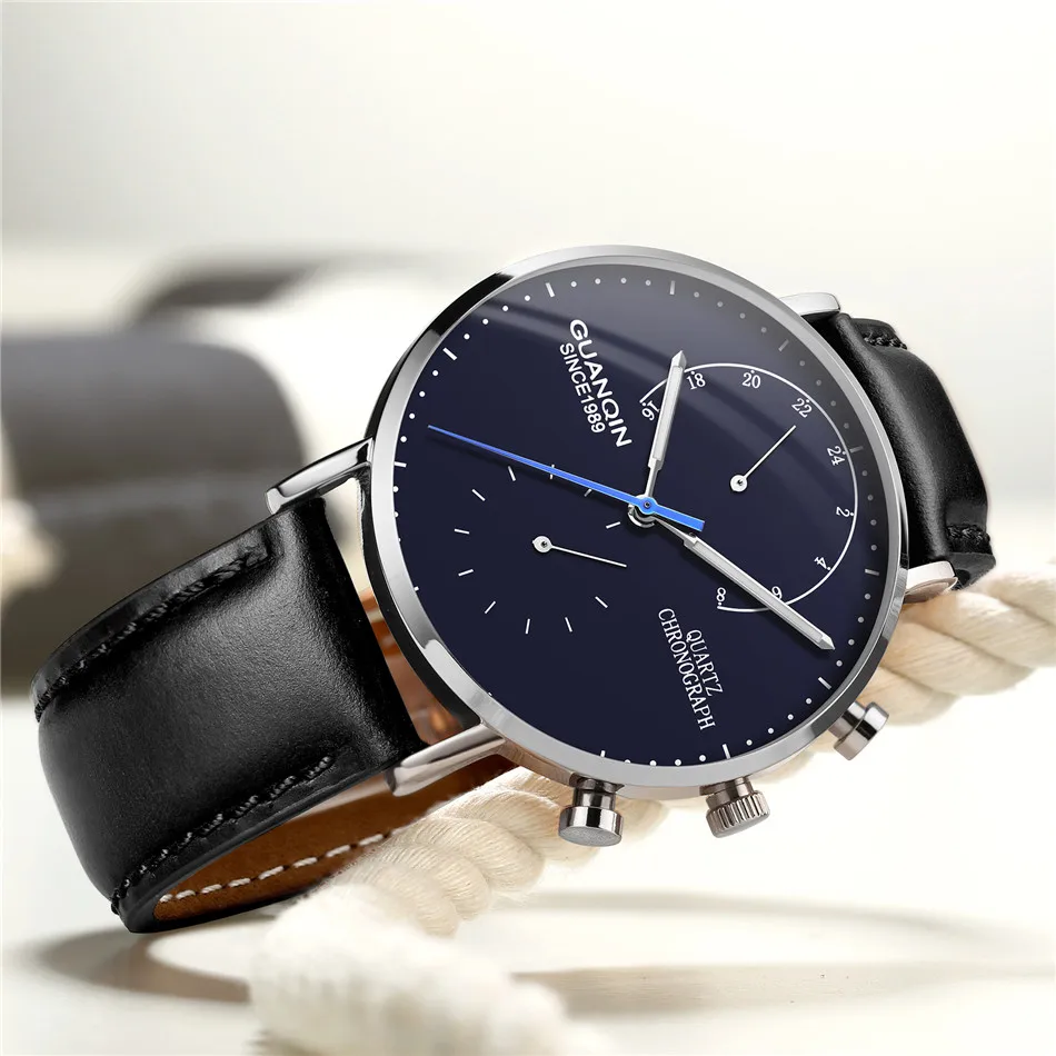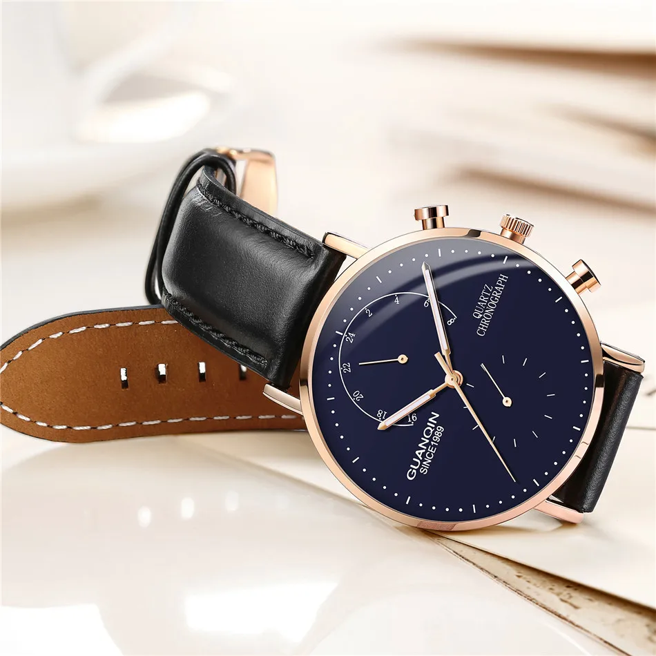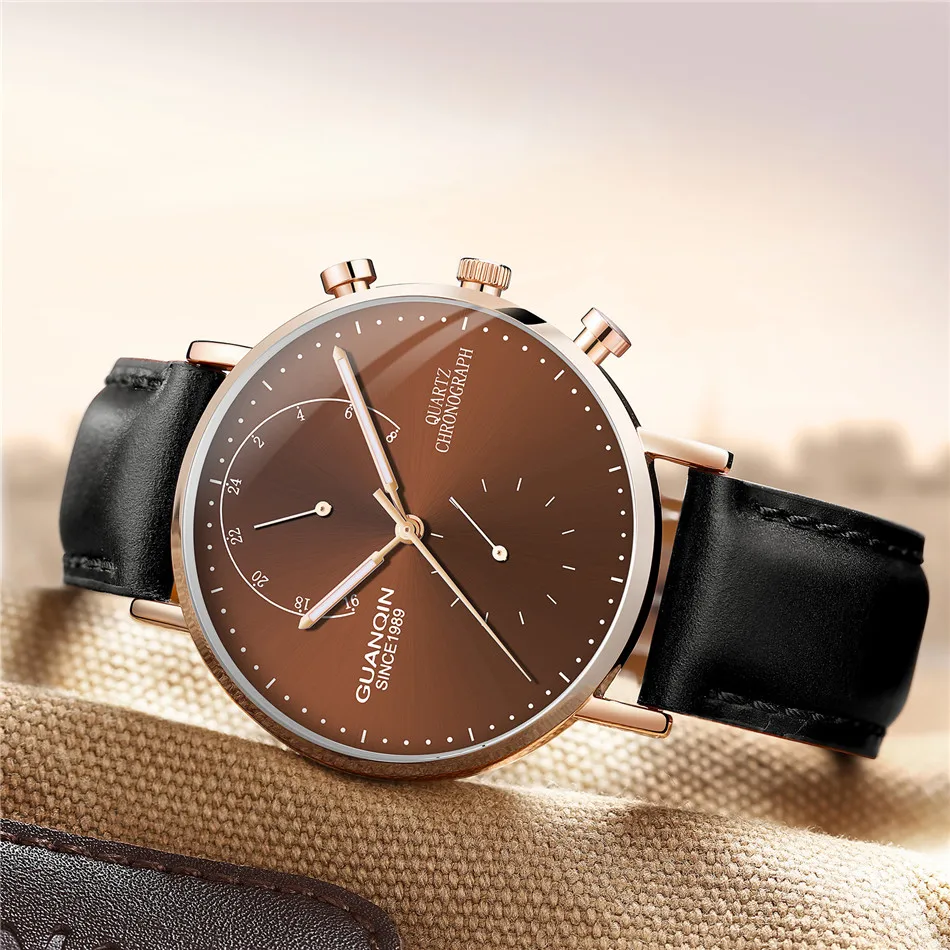 Часы наручные GUANQIN Мужские кварцевые, брендовые Роскошные модные креативные светящиеся аналоговые с хронографом и кожаным ремешком в стиле ретро