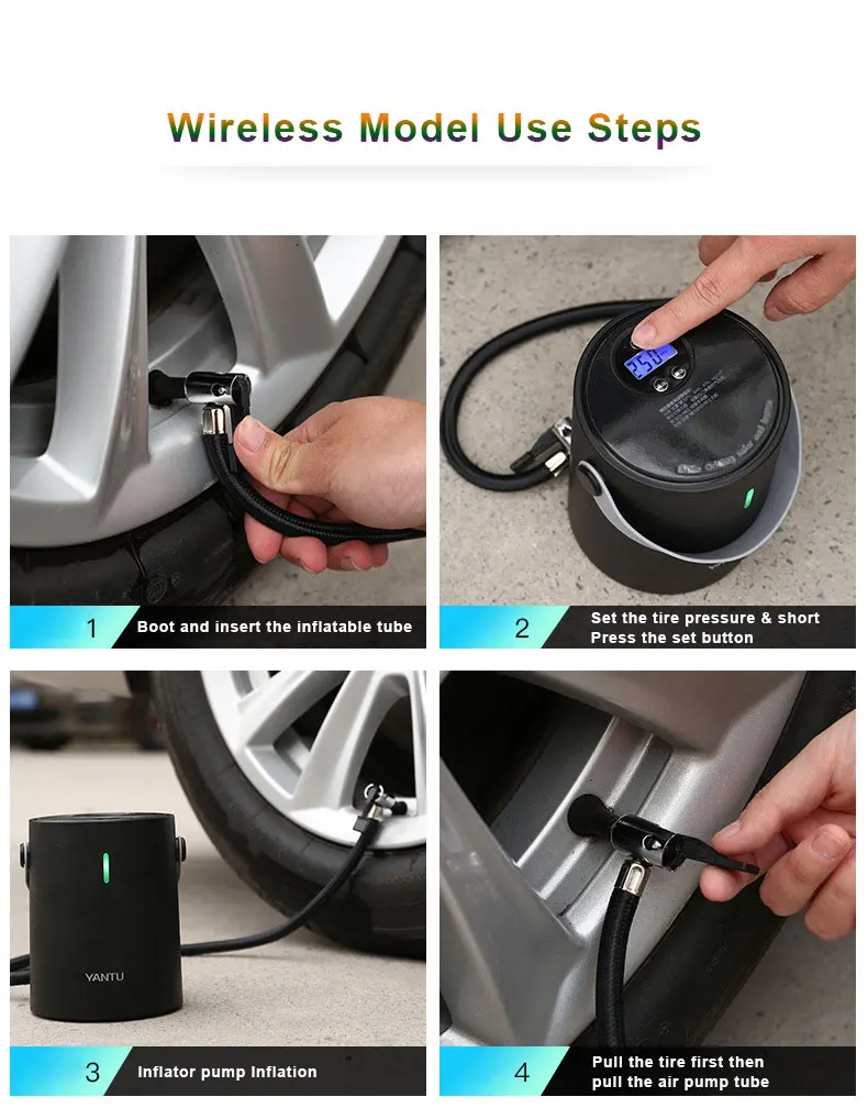 Характеристика: 1. Благодаря встроенному аккумулятору, наш беспроводной компрессор дает вам свободу принимать ваш воздушный компрессор в любом месте, не беспокоясь о поиске внешнего источника питания.Он также поддерживает зарядку дома и автомобиля.2. Предустановленное давление в шинах, автоматический цифровой дисплей, автоматическая остановка надувания.3. Подвесной двигатель, двойное шумоподавление, 60s быстрое пополнение газа и стабильная прокладка.4. Измерение давления ночного видения и дисплей Blu-ray,Удобное измерение давления дополнительного газа5. Все металлические цилиндры, сильные и хорошие тепловыделения, накачивание быстрее и стабильнее, более длительный срок службы.6. Компактный, без места, меньше, чем размер мини-планшета. Как использовать:1, ботинки и вставьте надувную трубку2. Установите пресс для шин и нажмите кнопку Set3. Инфляционный насос4. Сначала Вытяните шину, а затем вытяните трубку воздушного насоса Настройки:Нажмите кнопку «Настройки», чтобы переключить устройства.Нажмите кнопку «Настройки», чтобы запустить воздушный насос.Снятие Стресса:Снижает давление в шинахДавление:Увеличение давления в шинах