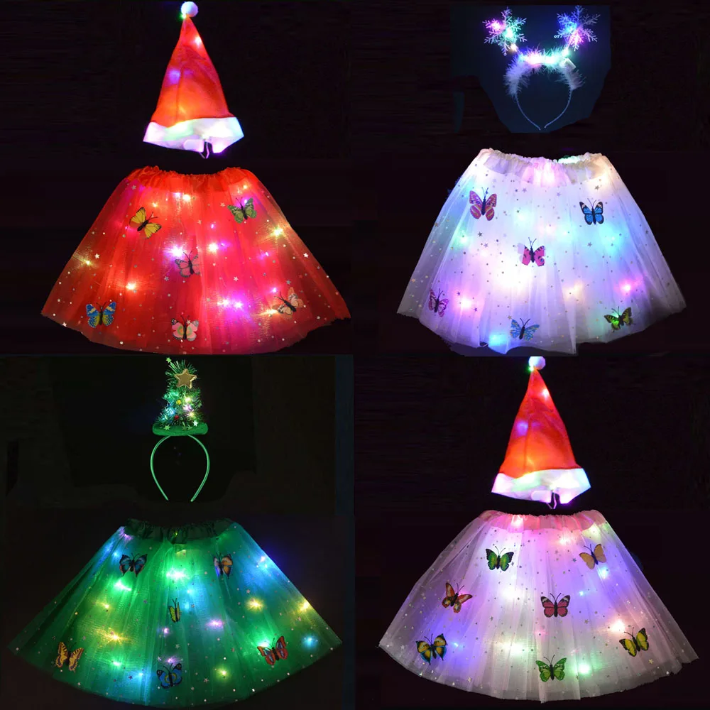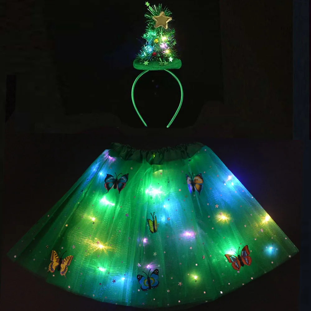 Светодиодная маскарадная юбка для девочки, юбка принцессы, повязка на голову с деревом, шапка Санта-Клаус, светящиеся праздничные костюмы для косплея