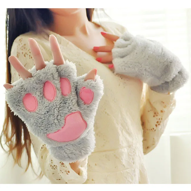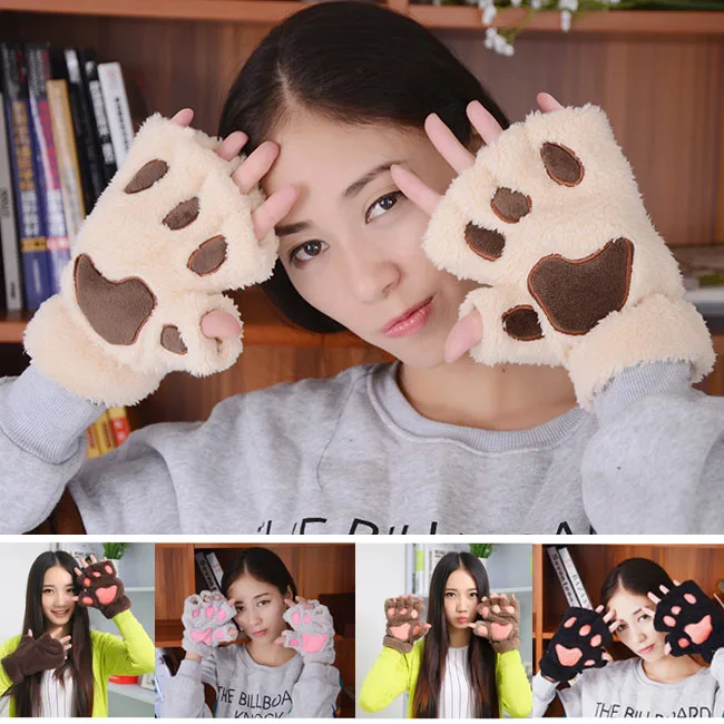 Зимние женские плюшевые рукавицы с медвежьими кошачья лапа с когтями, Короткие рукавицы с короткими пальцами для девушек, Короткие рукавицы без пальцев, женские перчатки