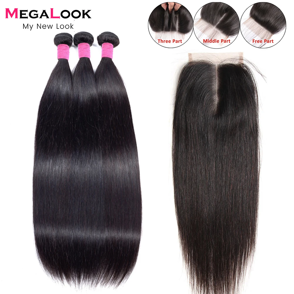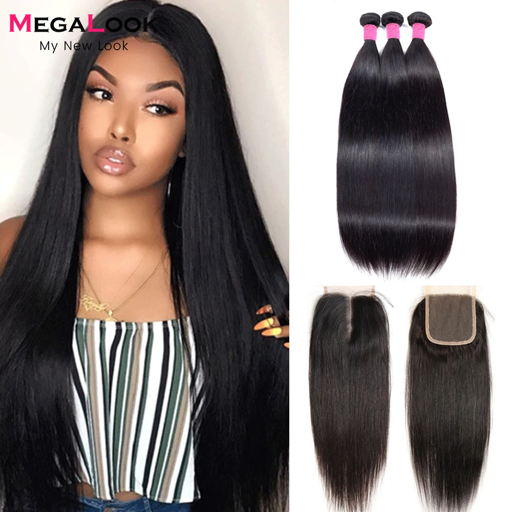 Бразильские виргинские волосы прямые пряди с 4x4 кружевной застежкой Megalook Доступные человеческие волосы для наращивания 3 пряди с закрытием