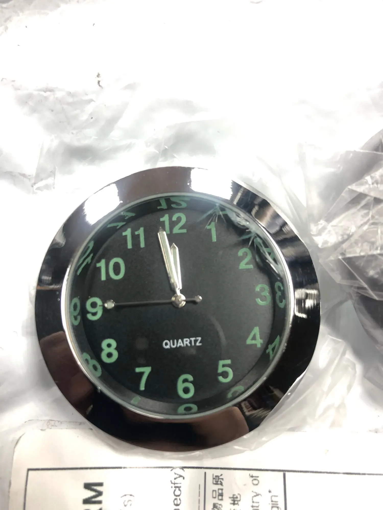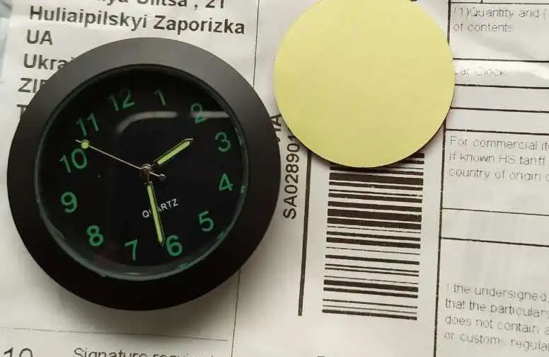 Товар соответствует описанию. Внешне часы выглядят неплохо. Стрелки и цифры светятся в темноте, как и было заявлено. Крепятся часы к панели двухсторонним скотчем, который есть в комплекте. Батарейка уже установлена внутри часов самим продавцом. Были упакованы в конверт с пупырышками, но без коробки. Дошли без повреждений. Товар был отправлен вовремя, но шел очень-очень долго (80 дней). После двух недель после отправки из Китая 50 дней не отслеживались вообще.