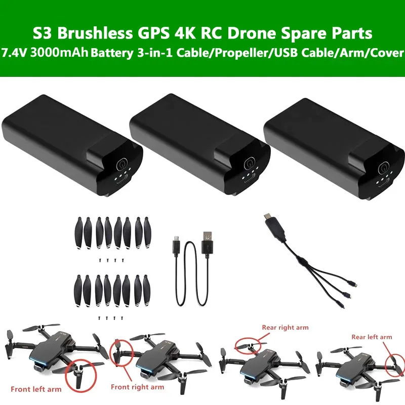 Название позиции: S3 бесщеточный GPS 4K RC Дрон запасные части 7,4 в 3000 мАч аккумулятор 3-в-1 кабель/пропеллер/USB кабель/Arm/крышка для S3 квадрокоптера