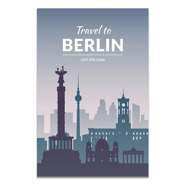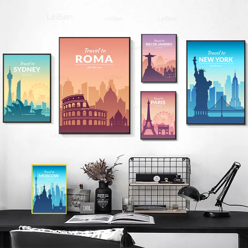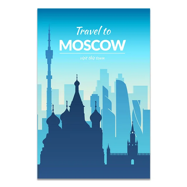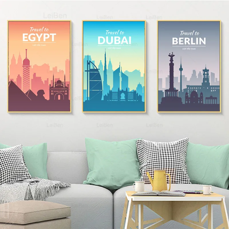 Мультяшный постер для путешествий, Москва, Дубай, Берлин, картина, известный городской пейзаж, холст, картина для современной фотографий