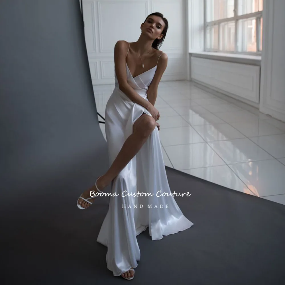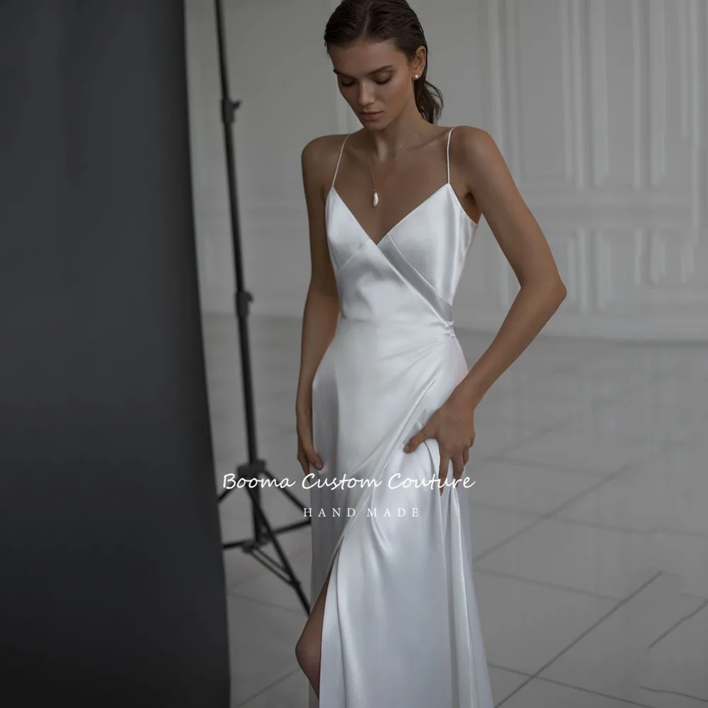 Платье невесты, на тонких бретелях, с V-образным вырезом, из мягкого атласа
