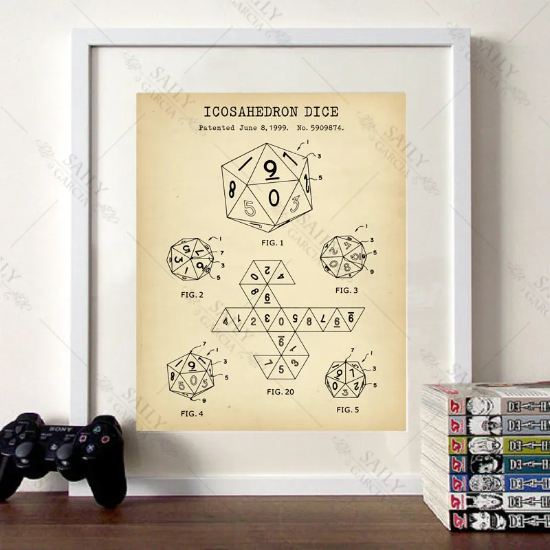20 сторонних игральных костей, патент, винтажные постеры и принты, подарки игрока Dnd D20 Icosahedron Dice, художественная раскраска, Настенный декор для игровой комнаты