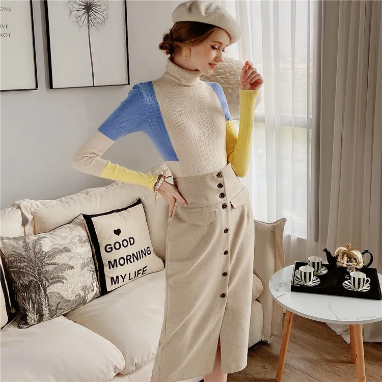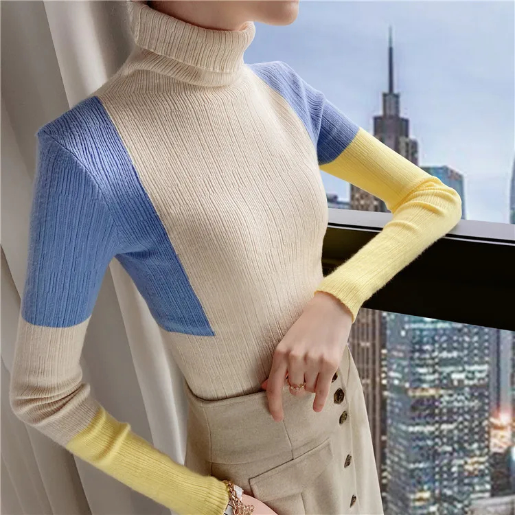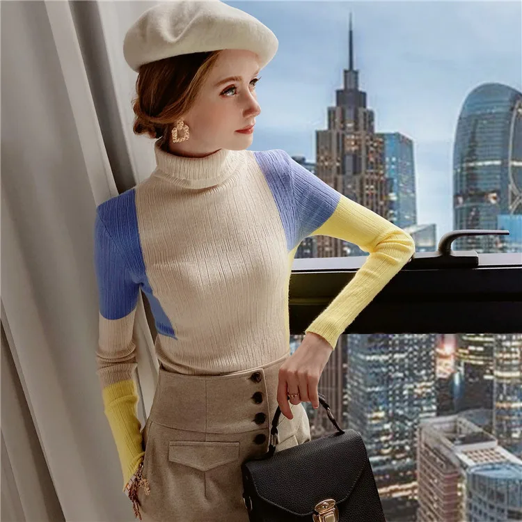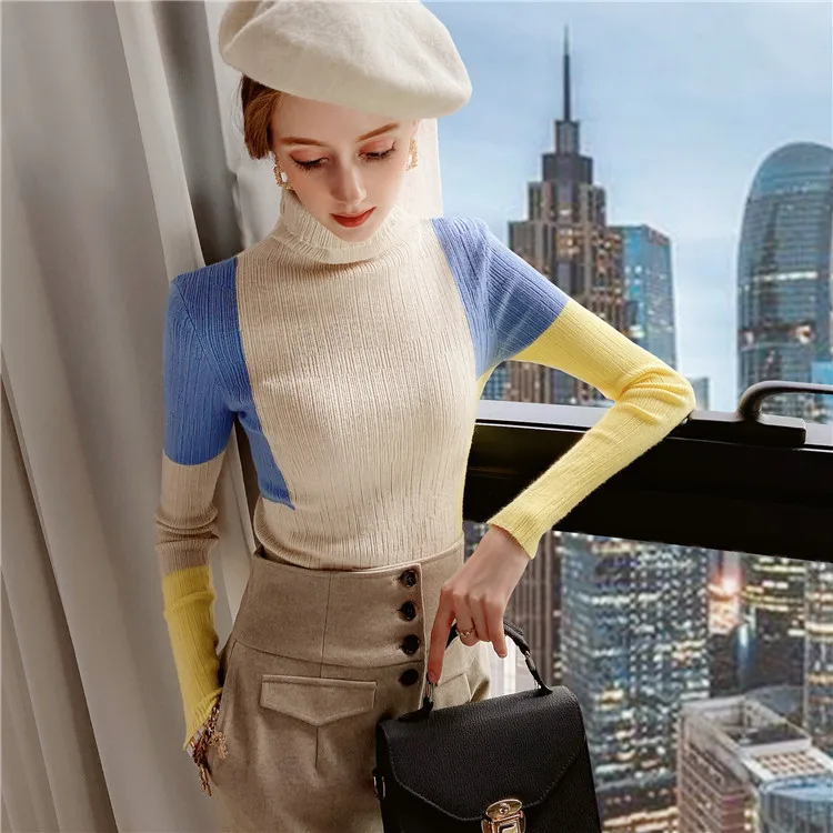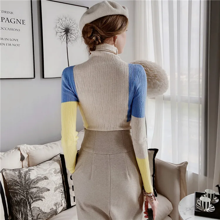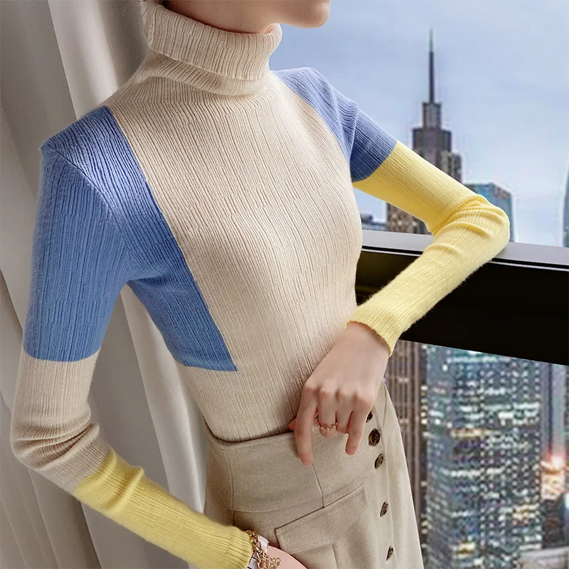 Повседневный пуловер Dabuwawa с высоким воротником в стиле пэчворк, свитер, женский осенне-зимний облегающий красочный вязаный свитер, женские свитеры DT1DJS021