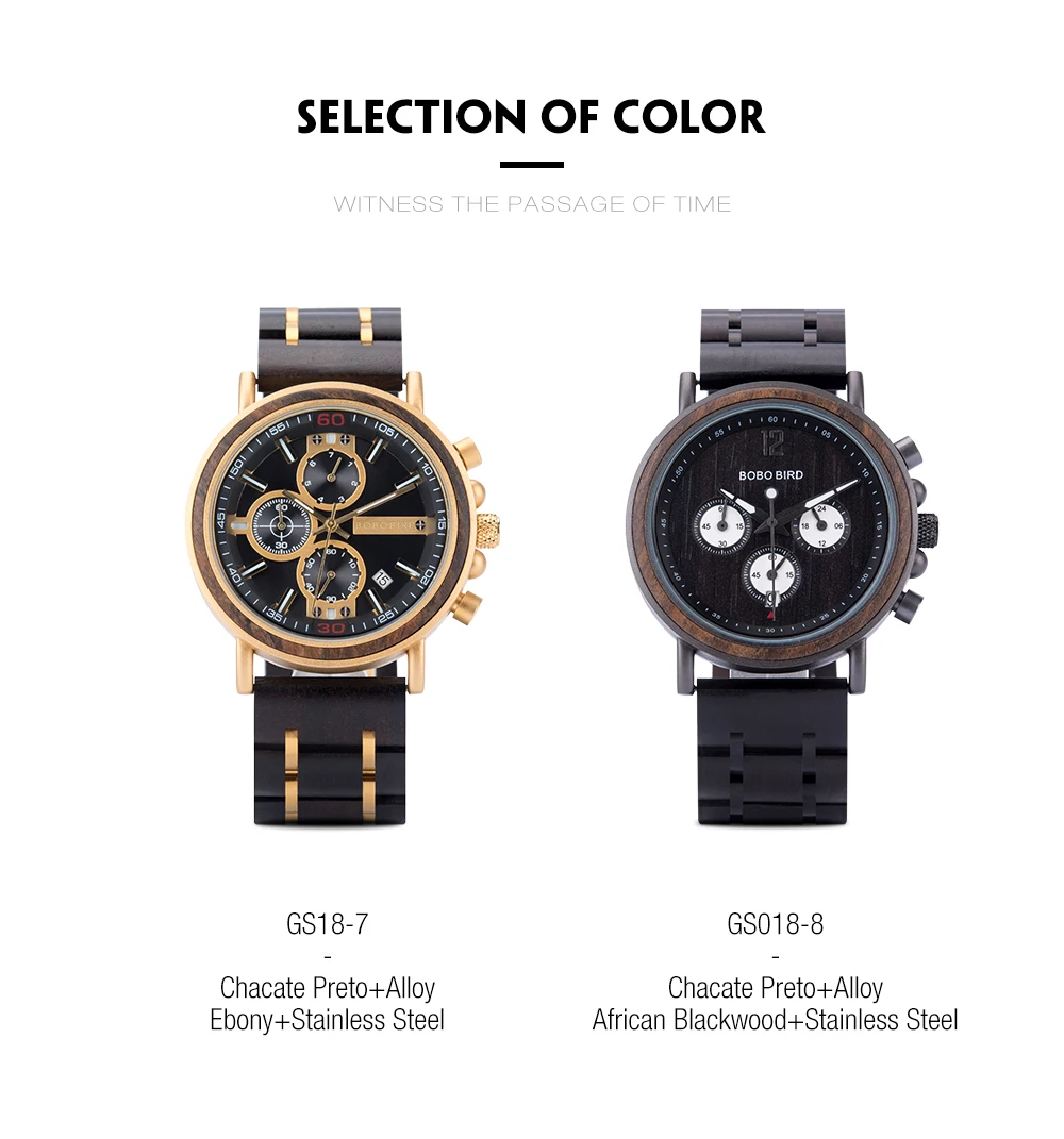 Бренд: BOBO BIRDПол: мужчиныМодель: GS018-1Стиль: модная роскошьМеханизм: кварцевый механизмВес: 103 гПериметр: 210 ммВодонепроницаемый для повседневной жизни