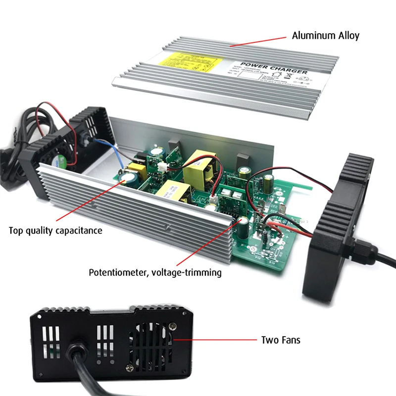 ● Функция защиты: перенапряжения/перегрева/перегрузки по току/короткого замыкания и полярности ● Светодиодный индикатор: красный-зарядка, зеленый-зарядка или подготовка к зарядке ● Стабильный, высокоэффективный, безопасный и т. Д. Точный предел напряжения и тока, квалифицированный полностью заряженный и избегайте перезарядки ● Использование алюминиевого радиатора, хорошая тепловая конструкция, может лучше охладить устройство питания, в соответствии с принципом потока горячего воздуха, продлить срок службы ● Основной силовой трансформатор принимает сердечник EC40, материал PC40, высокая эффективность, низкие потери железа, достаточная мощность, имеет достаточный запас мощности. ● Входной и выходной фильтр электролитический конденсатор выдерживает температуру-40 до + 105 ℃, с низким сопротивлением, высокой надежностью, долгим сроком службы, высокой пульсацией и т. д. Чехол из алюминиевого сплава имеет функцию рассеивания тепла, и два встроенных вентилятора образуют конвекцию воздуха, которая может лучше охладить устройство питания и продлить срок службы. ● Он содержит фильтры внутри, так что зарядное устройство значительно повышает эффективность защиты от помех. ● Есть потенциометр, он может регулировать напряжение в определенном диапазоне. ● Внутренняя схема продукта содержит предохранитель, эффект защиты от перегрузки всей цепи