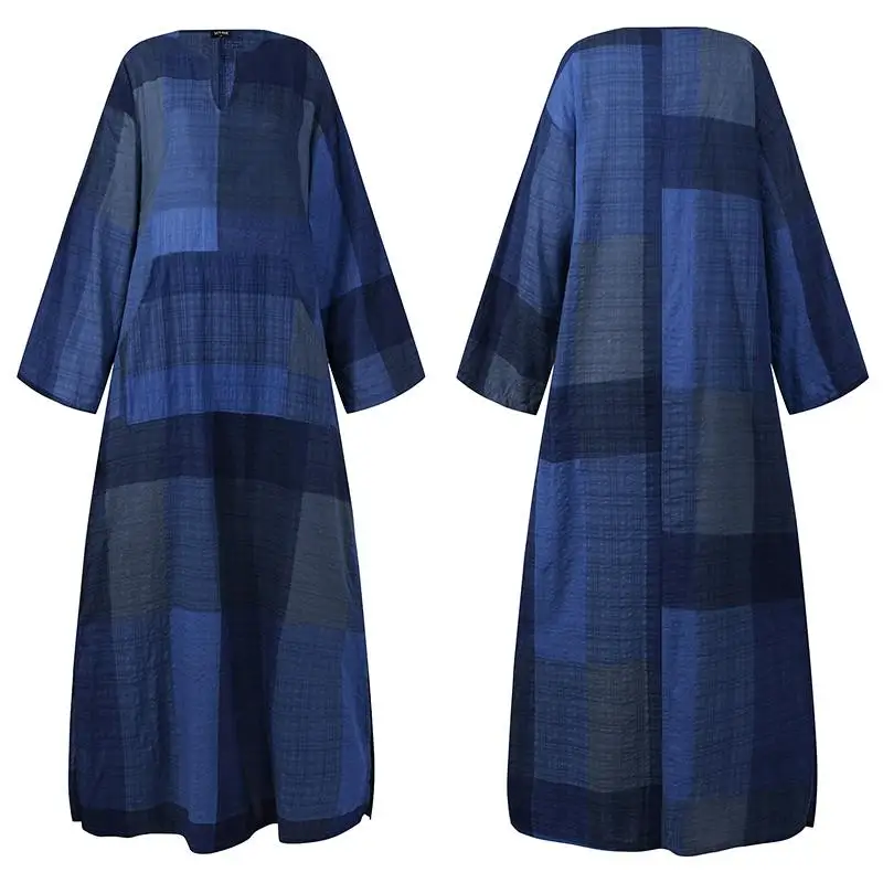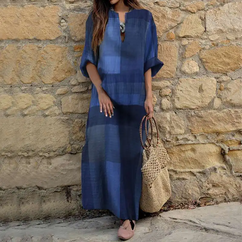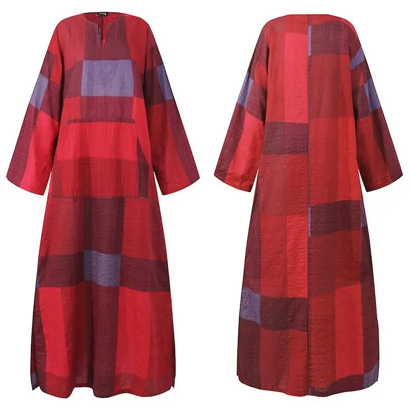 Женское платье-макси в клетку, с длинным рукавом и V-образным вырезом