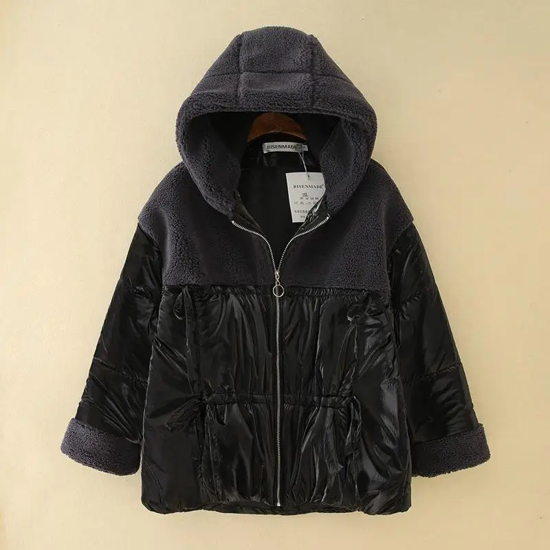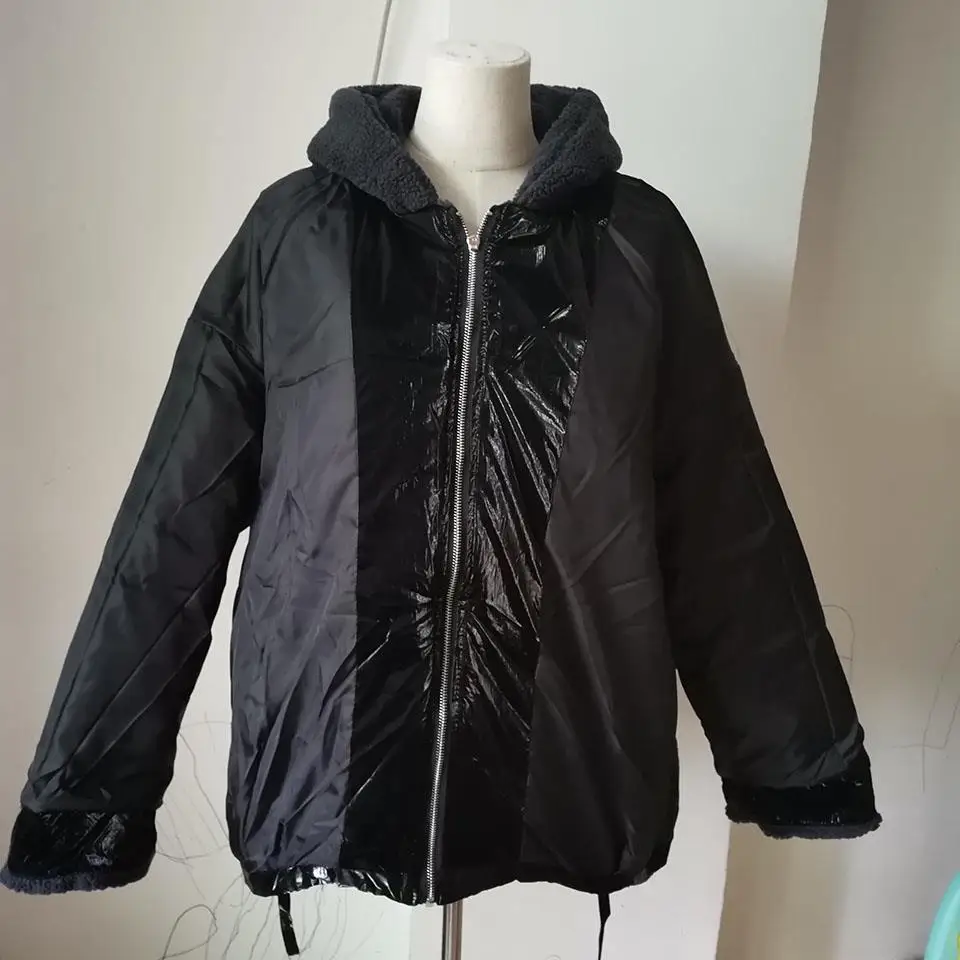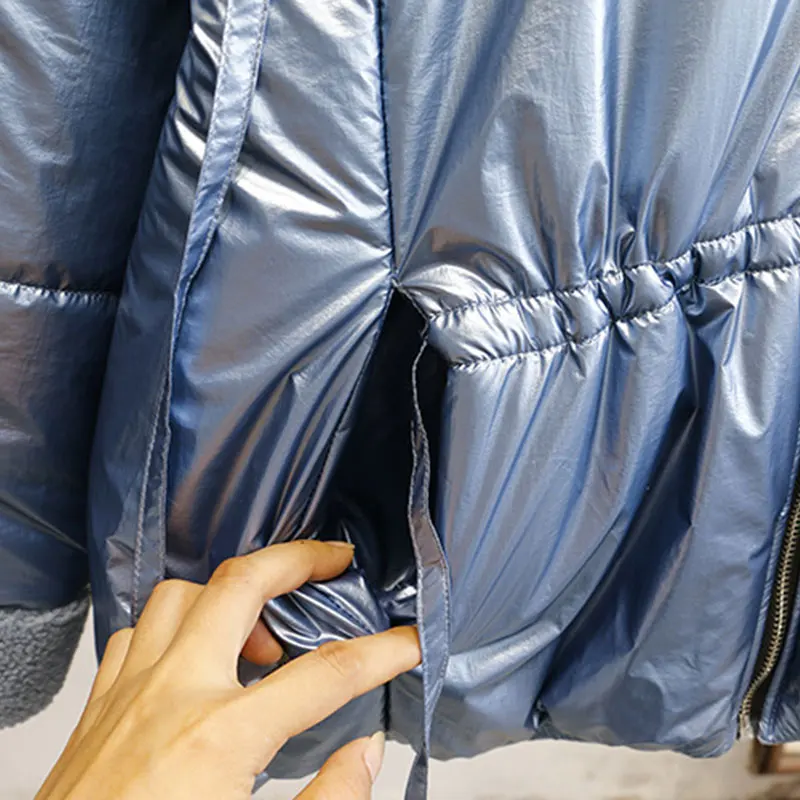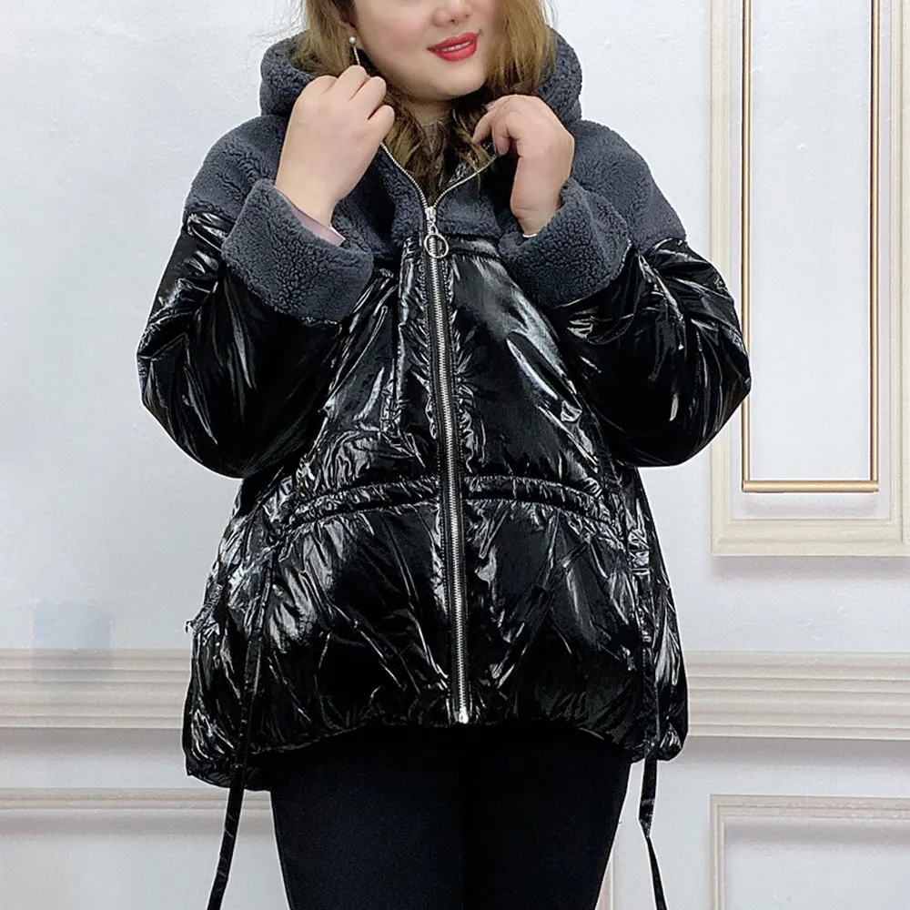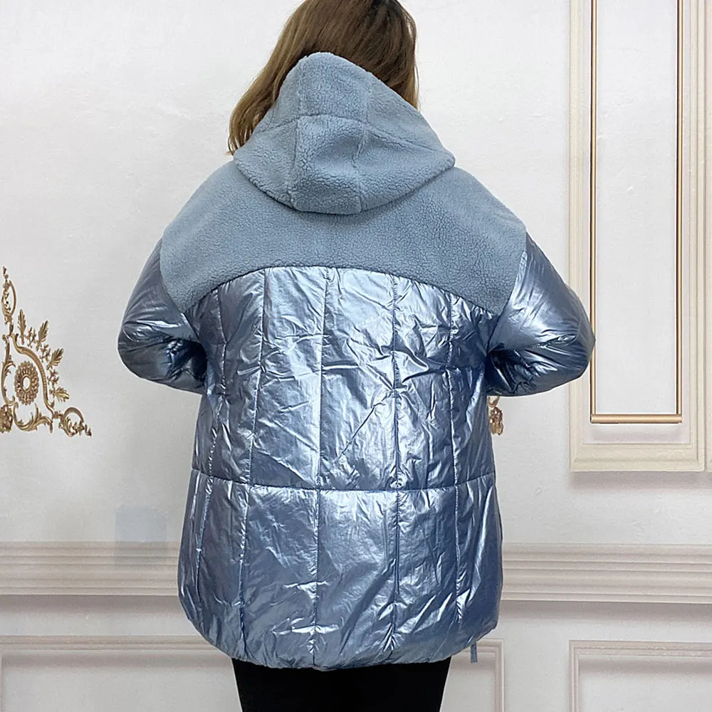 Женская одежда Парки Зимняя асимметричная куртка с подкладкой больших размеров Свободное флисовое сращивание блестящей ткани Теплое пальто с капюшоном