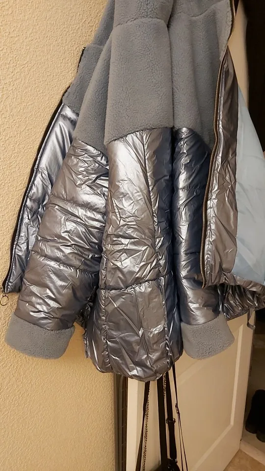 Блестящий глянцевый материал с синтетической толстовкой из овечьей шерсти, сзади длиннее, чем спереди. Куртка утеплена, но не для зимы. Фотографии и Таблица размеров продавца соответствуют действительности. Доставка была около 2 недель. Рекомендуем продавцу