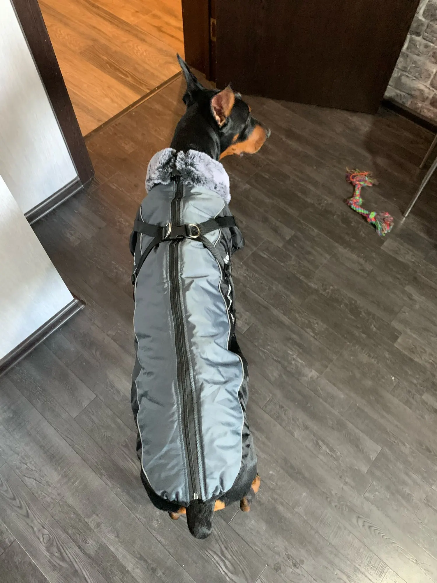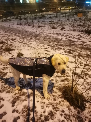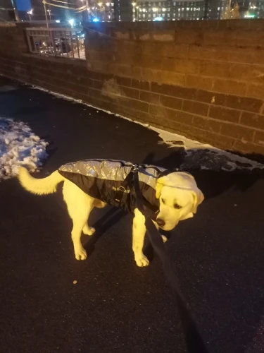 Отличная куртка! Для лабрадора немного длинновата, для добермана будет отлично. Доставка за 16 дней в Самару. Швы ровные, непромокаемая, верхняя часть очень хорошо отражает свет, молния удобная, с силиконовой подложкой, чтобы шерсть не прищемить, в целом удобная и продуманная вещь. Не совсем удачная только шлейка, но мы её отстегнули.