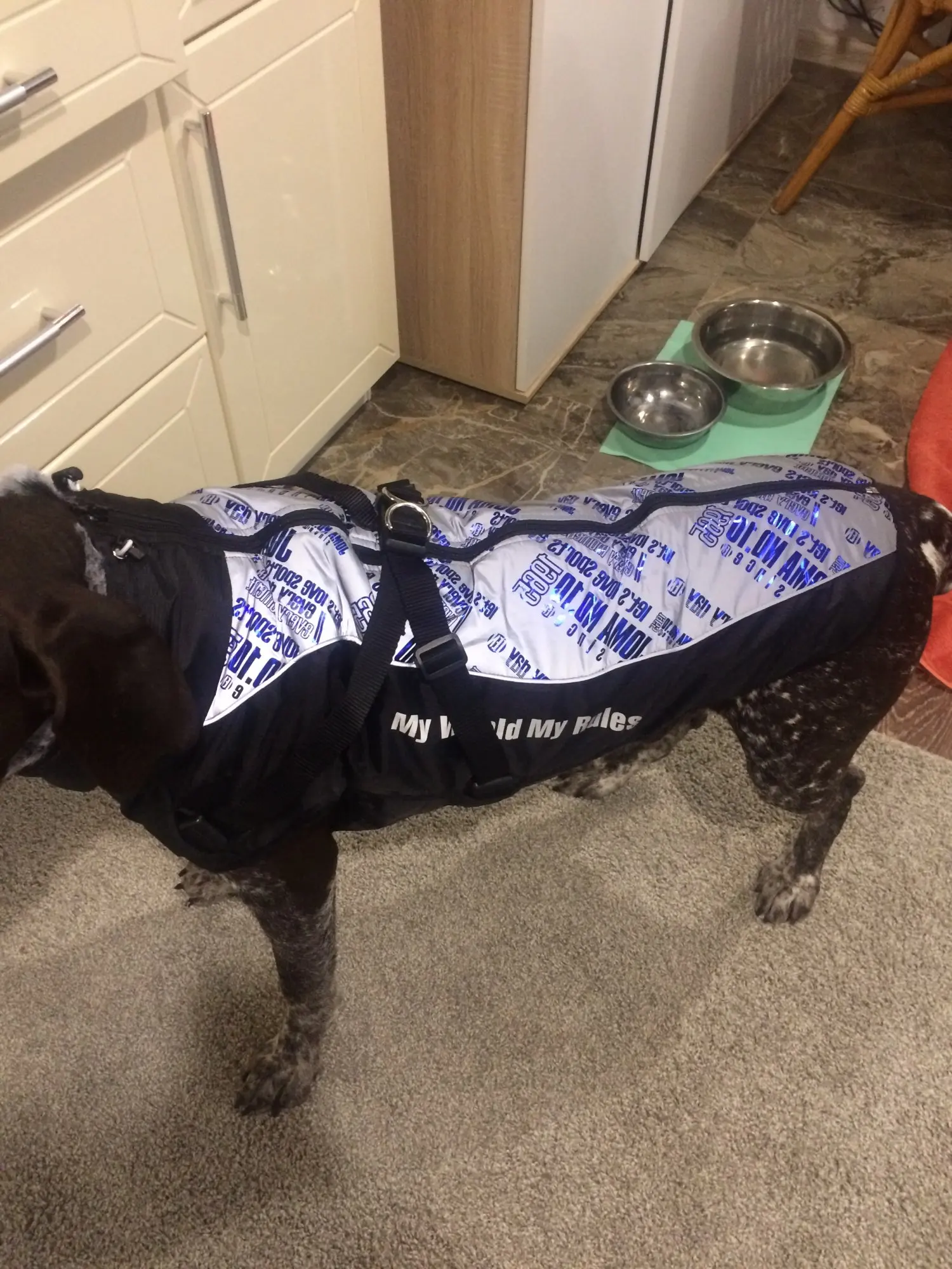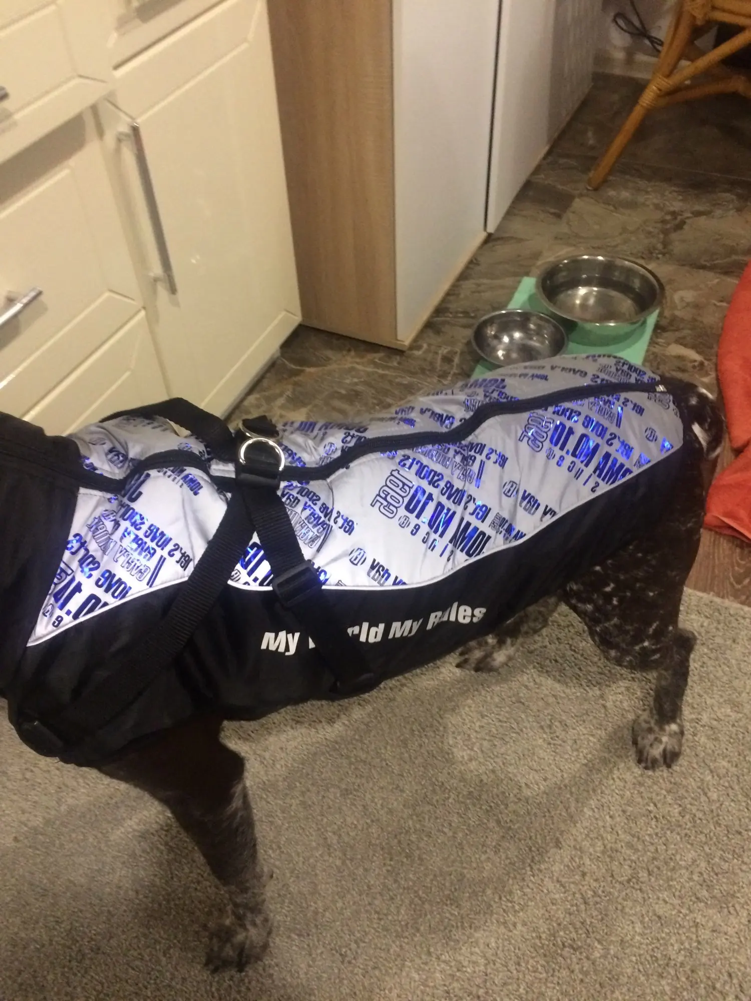 Мой Бруно кажется очень счастливым и комфортным. Быстрая доставка. Спасибо этой куртке Бруно может позволить себе больше гулять, не беспокоясь о низкой температуре.