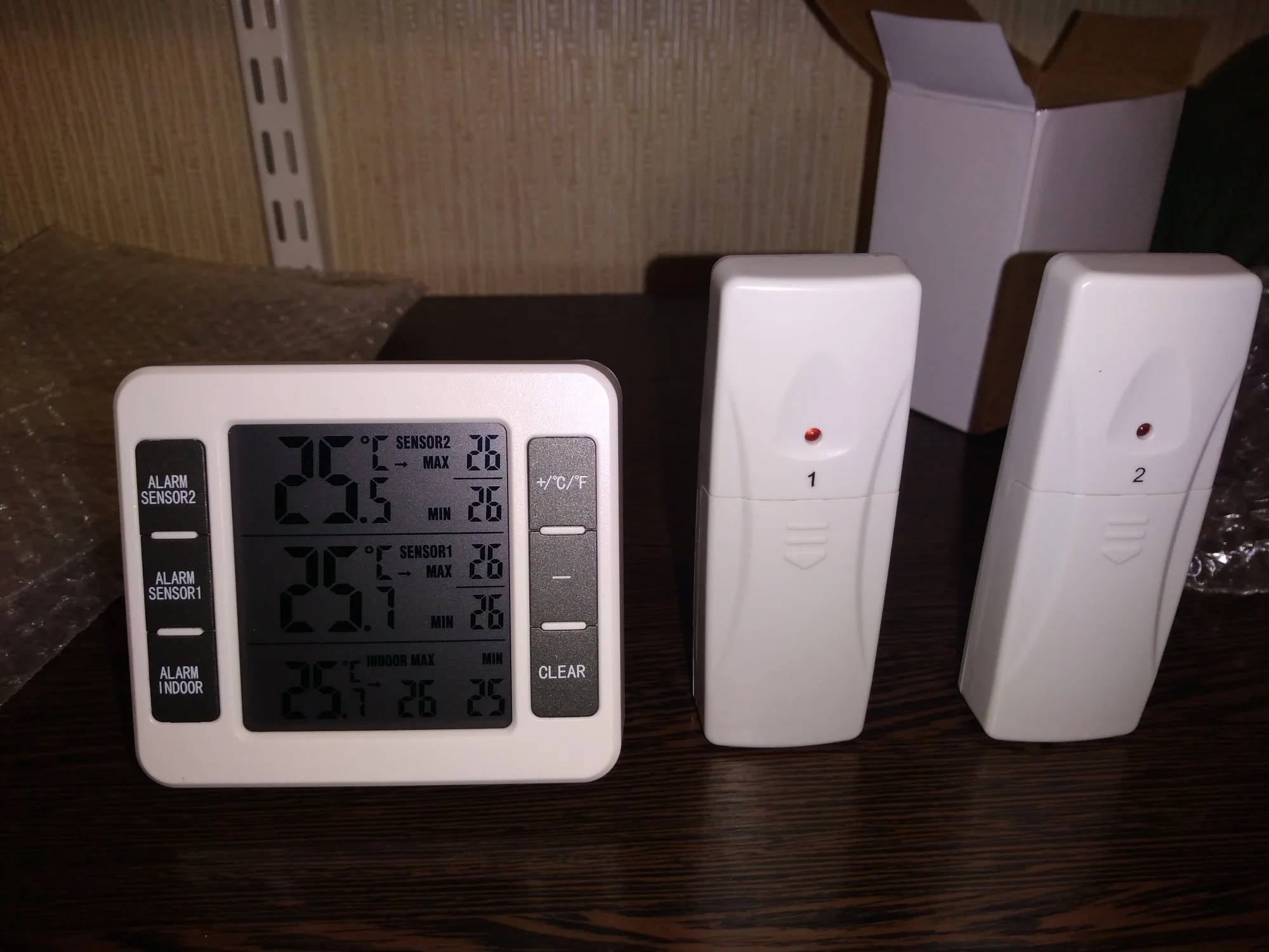 【 2 датчика 】 с 2 дистанционными датчиками, беспроводной термометр для холодильника может отображать температуру в помещении и 2 группы температуры на открытом воздухе одновременно. Вы можете поместить датчик в холодильник или на открытом воздухе.