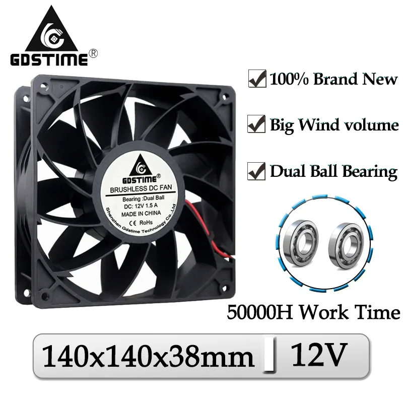 Gdstime DC 12 В 140x140x38 мм 140 мм двойной шар с высоким давлением ветра 2PIN корпус компьютера PC Кулер FanBrushless DC вентилятор охлаждения