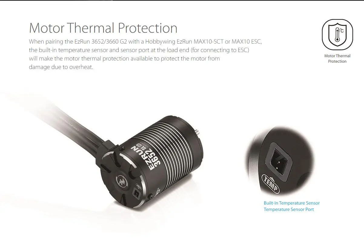 • Встроенный датчик температуры и порт датчика защищают двигатель от повреждений из-за перегрева при соединении EZRUN 3652/3660 G2 с ESC EZRUN MAX10/MAX10 SCT.