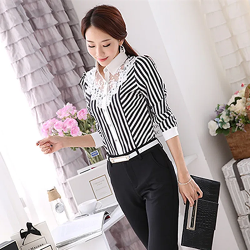 Новая женская кружевная блузка с вышивкой OL, топы, женская Облегающая рубашка, корейский модный топ в полоску, размера плюс 4XL