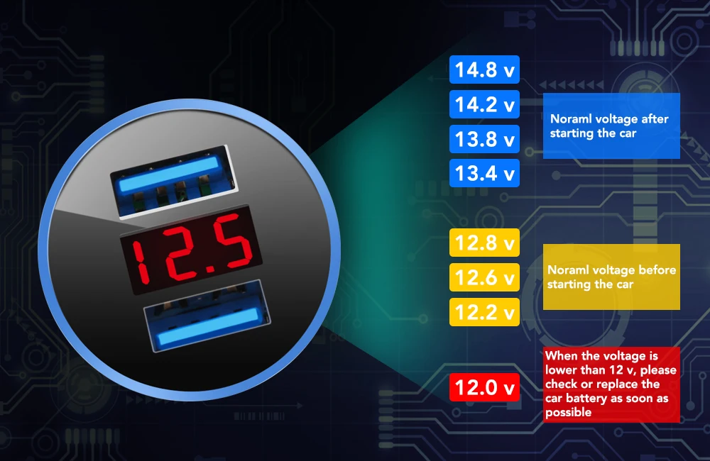 Мониторинг напряжения автомобильного аккумулятора в режиме реального времени (когда устройство не подключено для зарядки; Отображение тока зарядки при зарядке телефона);