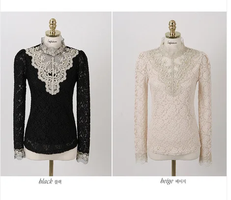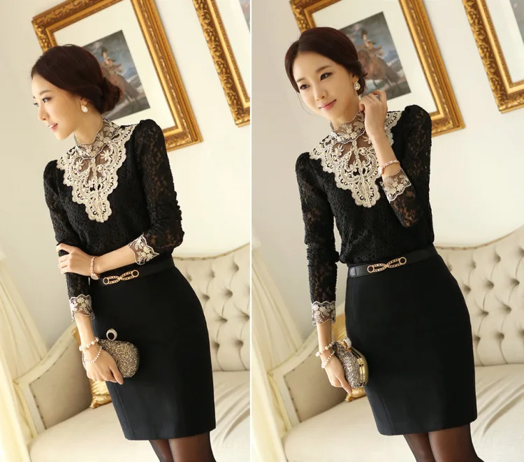Рубашка женская с воротником-стойкой, пикантная Кружевная блуза с вышивкой с длинным рукавом, размера плюс, 3XL, черный топ, весна-осень