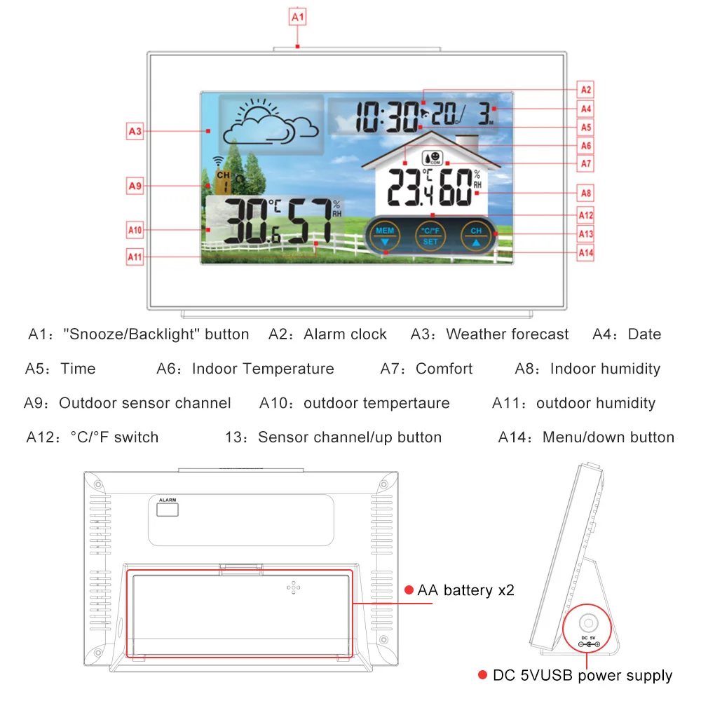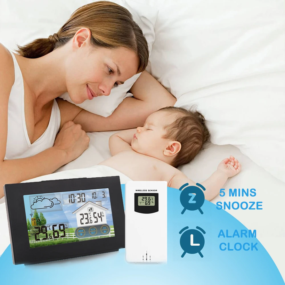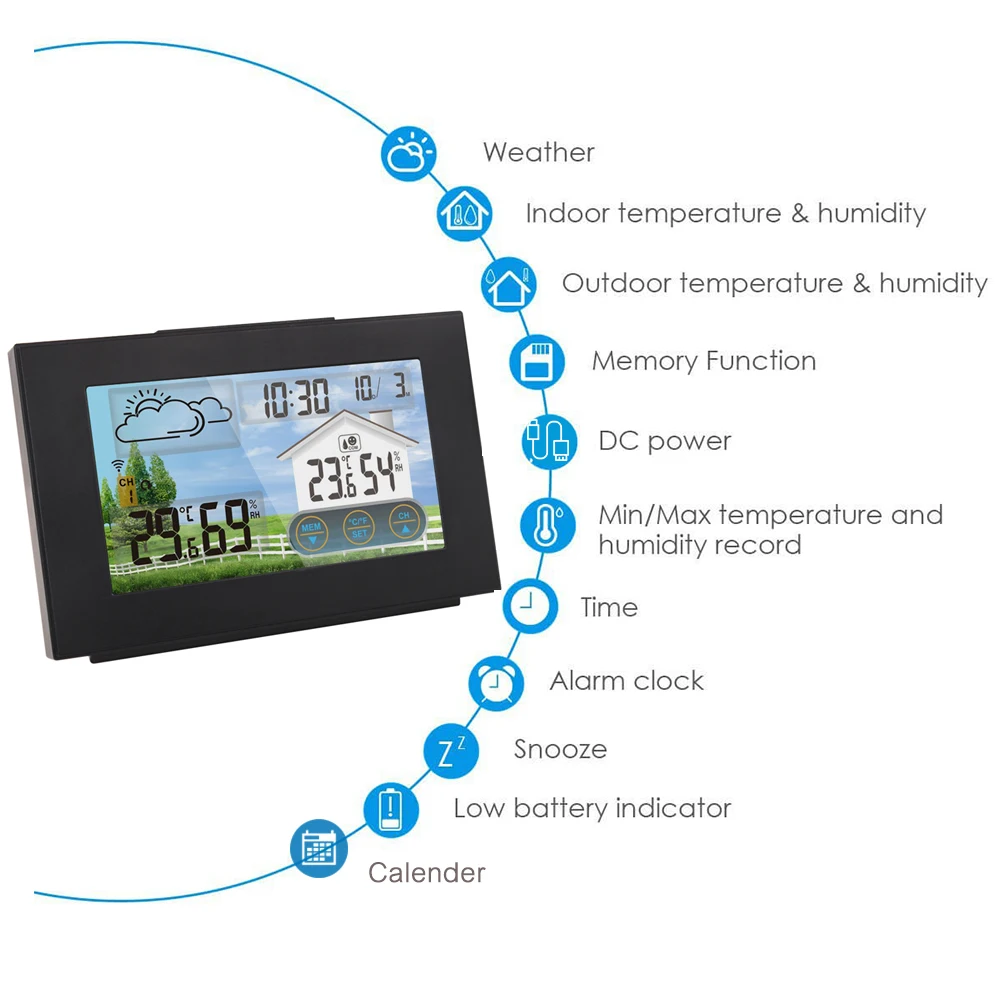 Особенности:3-канальная температура/Влажность-Беспроводная метеостанция использует передовую технологию радиочастотного датчика, может поддерживать до 3 беспроводных наружных датчиков (только 1 входит в комплект), который точно собирает данные, И быстро передает на внутренний приемник. Дальность передачи 60 метров на открытой местности. Уровень водонепроницаемости (наружный датчик) IPX4.Цветной сенсорный ЖК-экран-большой цветной сенсорный ЖК-экран с 4 уровнями подсветки (высокий/средний/низкий/выкл), который отображает больше необходимой информации: температура и влажность в помещении/на улице (Макс/мин), время/дата, будильник/Повтор (дополнительный 5-минутный сон), яркий прогноз погоды и комфортный уровень в реальном времени.Предсказание нескольких погоды-домашняя метеостанция на основе переменных, связанных с погодой, включая изменения температуры, влажности и барометрического давления для создания индивидуального прогноза для вашего местоположения, есть 4 вида прогнозов погоды (солнечная, облачная, пасмурная, дождь).Будильник с функцией повтора сигнала-эта Метеостанция имеет функцию будильника с функцией повтора сигнала. Поместите его в спальне, это не только Беспроводная метеостанция, но и будильник с функцией повтора сигнала. Вы получите более 5 минут повтора.Два режима мощности-метеостанция с цветным дисплеем, использующая аккумулятор в качестве резервного источника питания (не входит в комплект), источник питания USB можно отключить при выходе из дома, а Метеостанция по-прежнему может нормально работать.Спецификация:Материал: АБСЦвет: черныйРежим времени: 12 часов/24 часаКалендарь: до 2099Будильник: функция ежедневной сигнализацииФункция повтора сигнала: 5 минутВлажность: внутренний и наружный измеряемый диапазон: 20% ~ 95% относительной влажностиТемпература: в помещении: 0 ℃ (32 ℉) ~ 50 ℃(122 ℉) /на открытом воздухе: -40 ℃ (-40 ℉) ~ 70 ℃(158 ℉)Единение температуры: ℃ / ℉3 уровень комфорта в помещении: запись максимального/минимального значения температуры и влажностиБеспроводной наружный Датчик: поддерживает до 3 беспроводных датчиков (только 1 входит в комплект)Водонепроницаемость: IPX4Трамиссия данных: 60 м на открытой местностиУстановка: настенное крепление или подставкаОсновные функции: будильник/повтор сигнала/Календарь/проверка влажности в помещении и на улице/Прогноз погоды/комфортное выражениеИсточник питания: 2 x LR6 AA (не входят в комплект)/зарядка через USBРазмер изделия: 161*115*32 мм/6,34*4,53 * дюймаВес изделия: 214 г/7,55 унцииУпаковочный лист:1 * Беспроводная метеостанция1 беспроводной датчик1 * USB кабель1 * Руководство пользователя