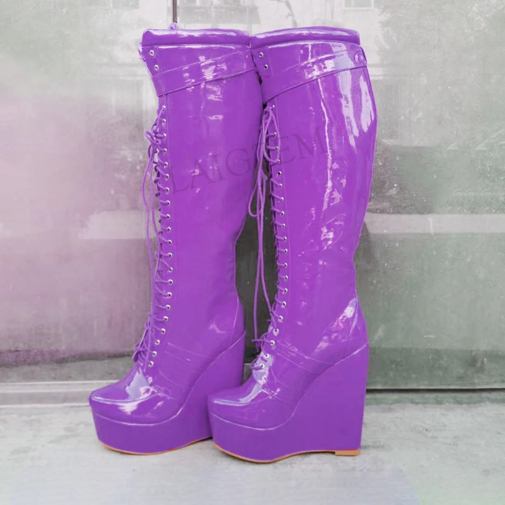 DOBANER/женские сапоги до колена на танкетке с широким клиньем; Блестящая женская обувь; Женская обувь; Большие размеры 42, 43, 45, 48, 52